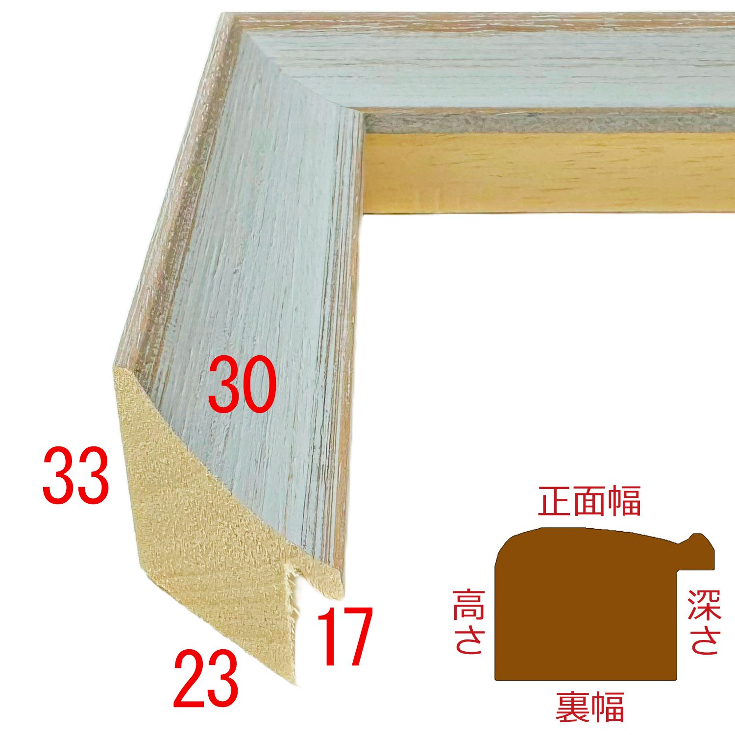 水色のパステルカラーと木目が調和するプレミアムフレーム