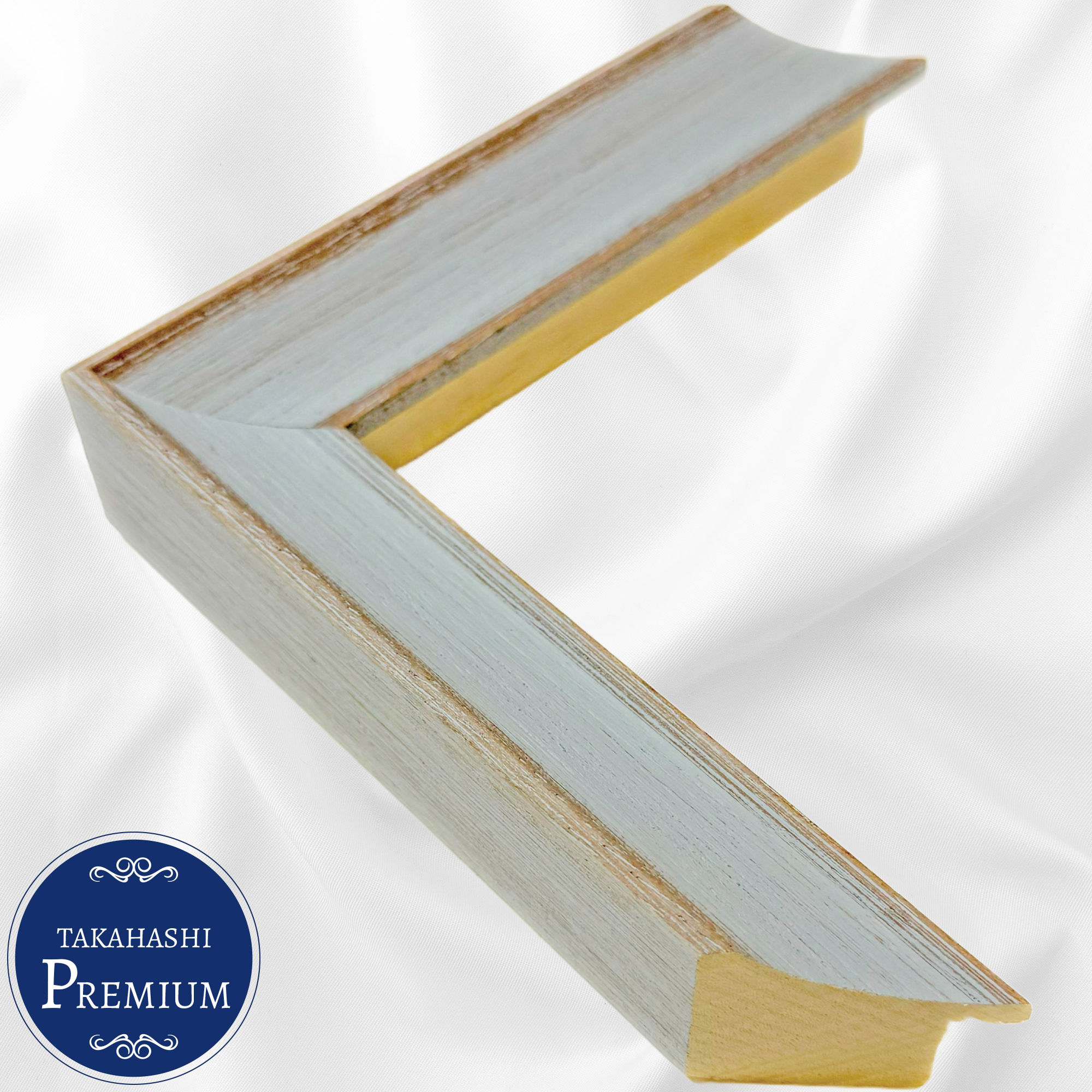水色のパステルカラーと木目が調和するプレミアムフレーム