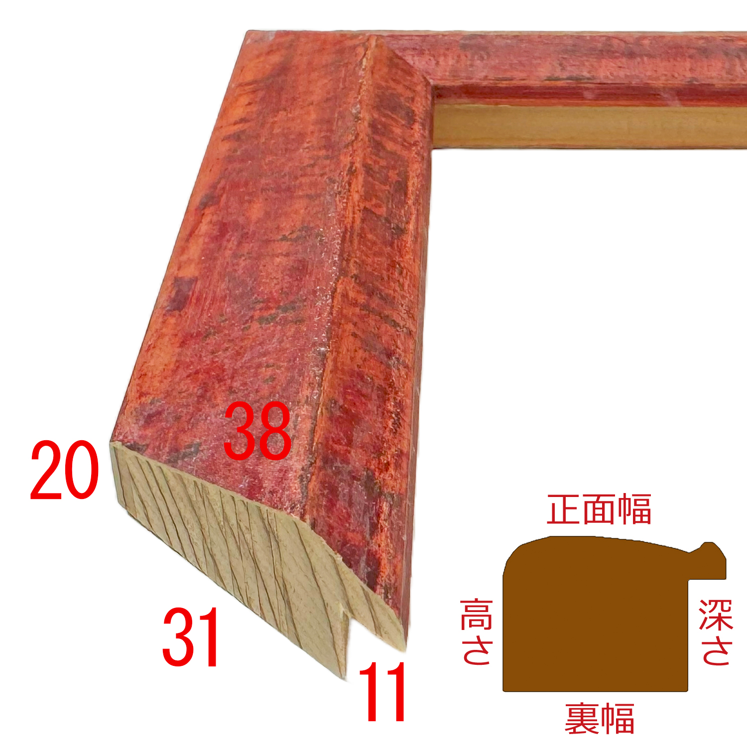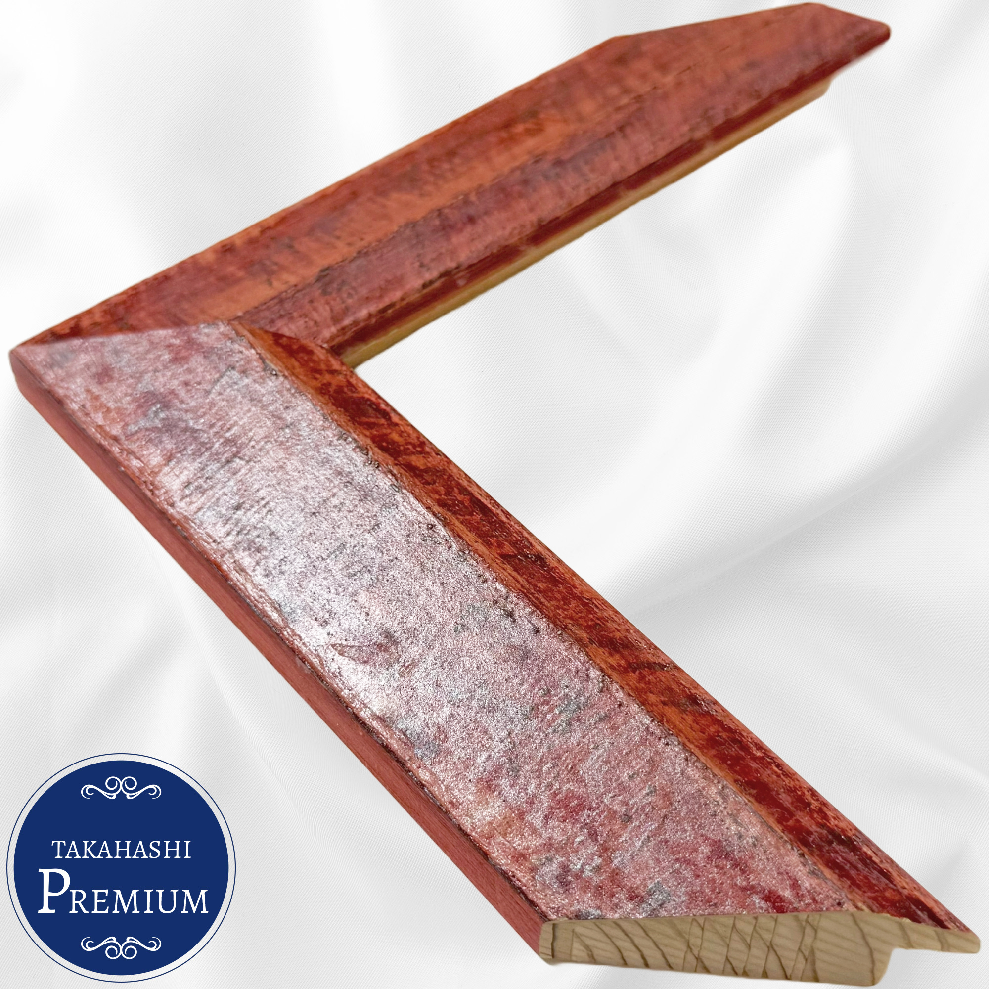 木製(アユース材)。イタリア製のオーダーフレーム。厚塗りの塗装が時代を経たような色合い。朱色から赤のグラデーションが美しい。