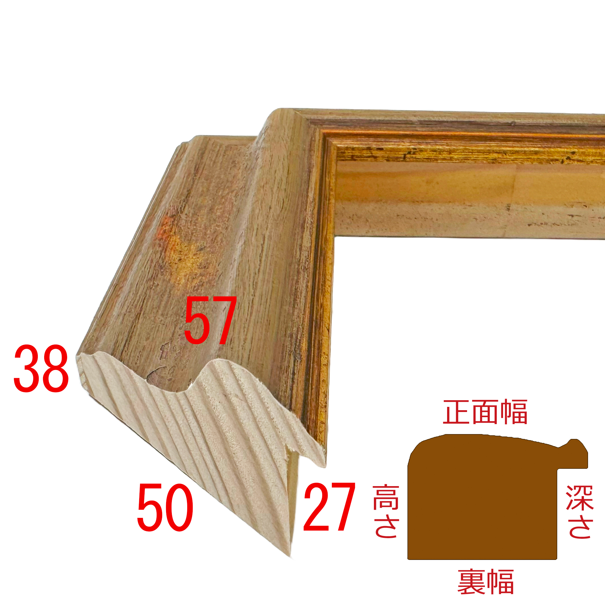 木製(パイン材)。イタリア製のオーダーフレーム。額縁の内側から外側にかけて傾斜する外流れ。額縁のデザインとしてポピュラーな外流れですが、こちらのフレームは特に傾斜の高低差があります。視覚を広げ、お部屋との一体感が生まれます。