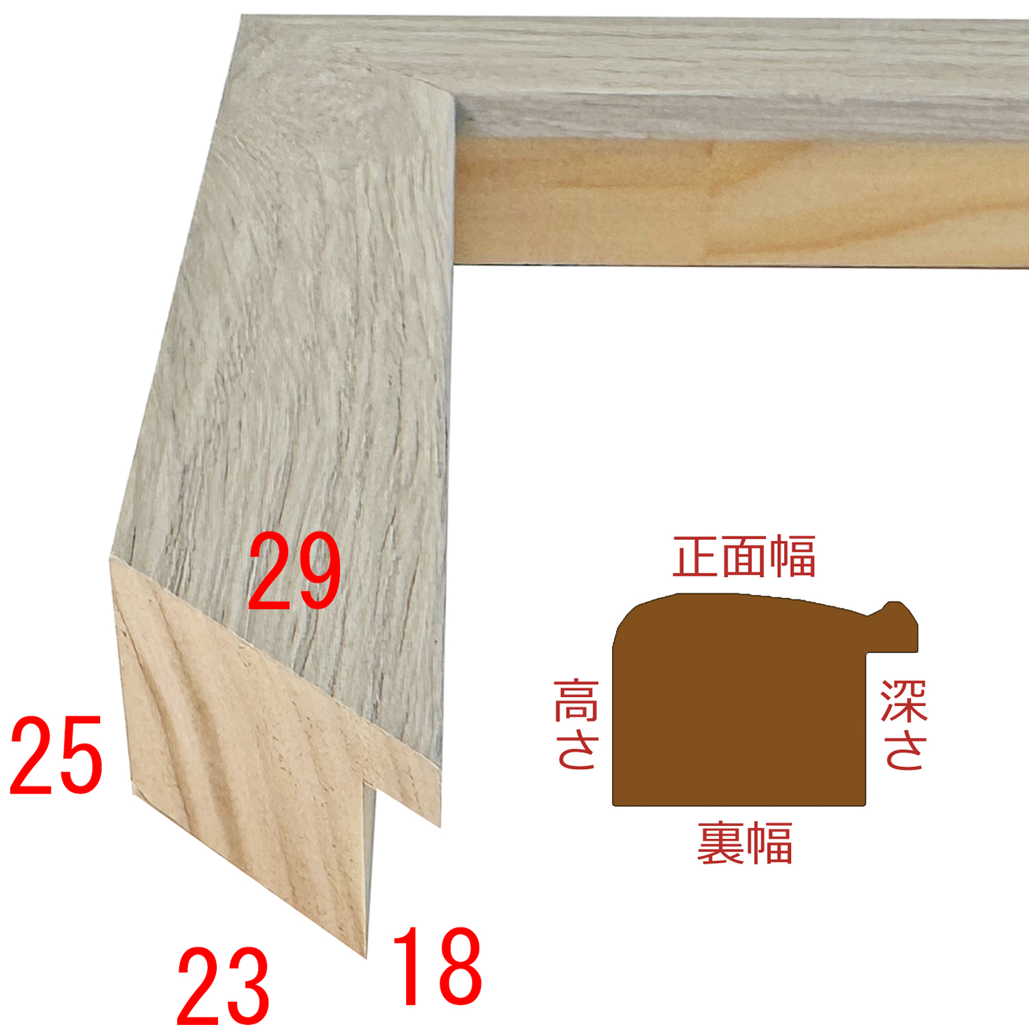 木製(FSC認証パイン材)、オーダー製作専用フレーム。ラフな木肌を模した淡い灰色のフレーム。平角のシンプルなデザインですが味わいのある額装に仕上がります。