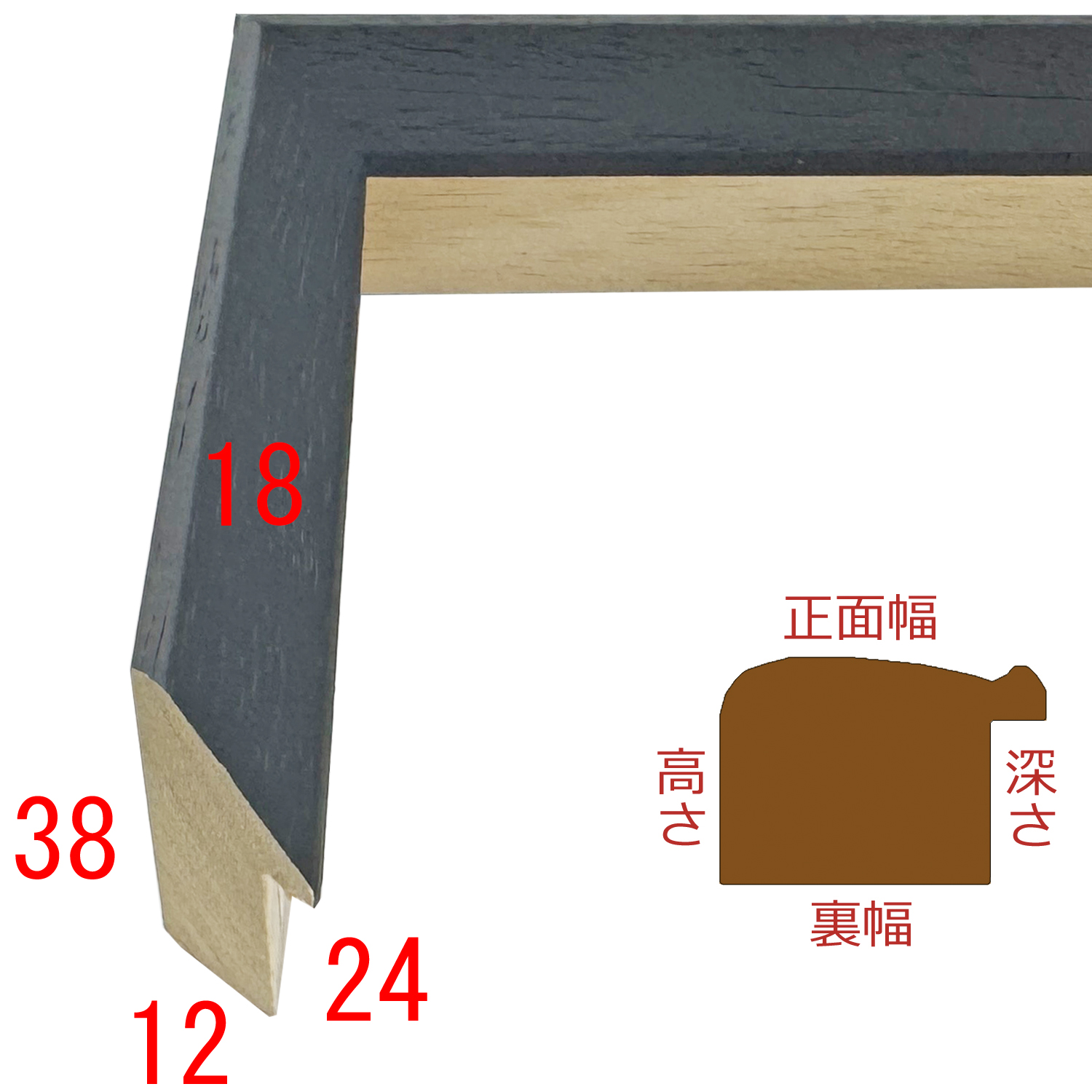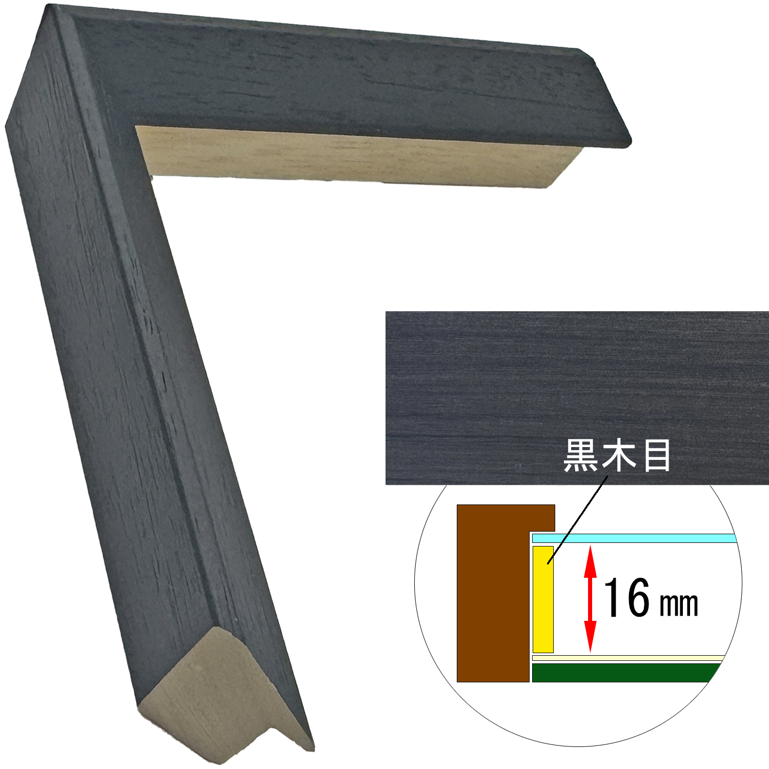 このフレームは「フレーム深さを活かした立体額」の製作も可能です。上の画像では、「フレーム深さを活かした立体額」を製作した場合の、額縁内部深さや深さを支えるパーツの色も紹介しておりますが、オーダーフレームの仕様によって額縁の構造は変わりますのでご注意ください。