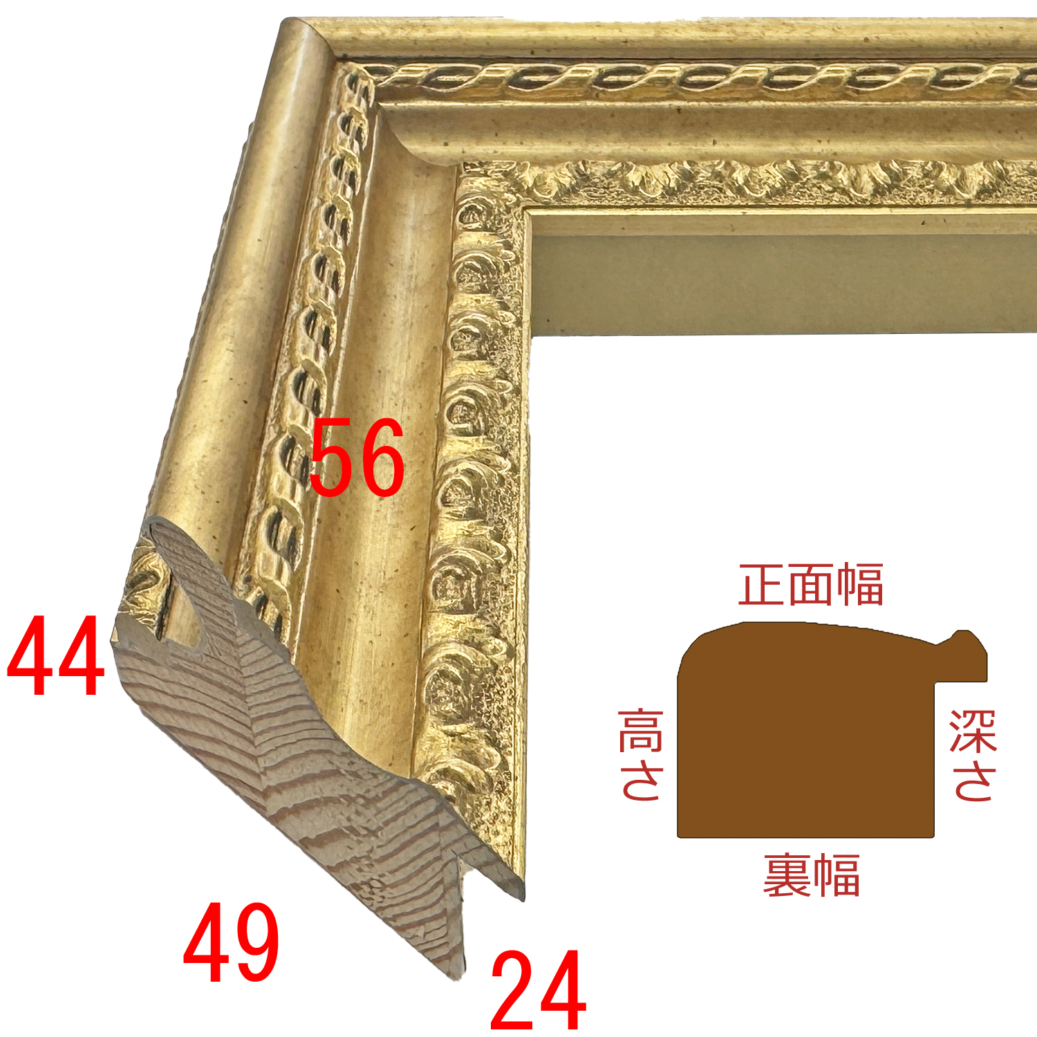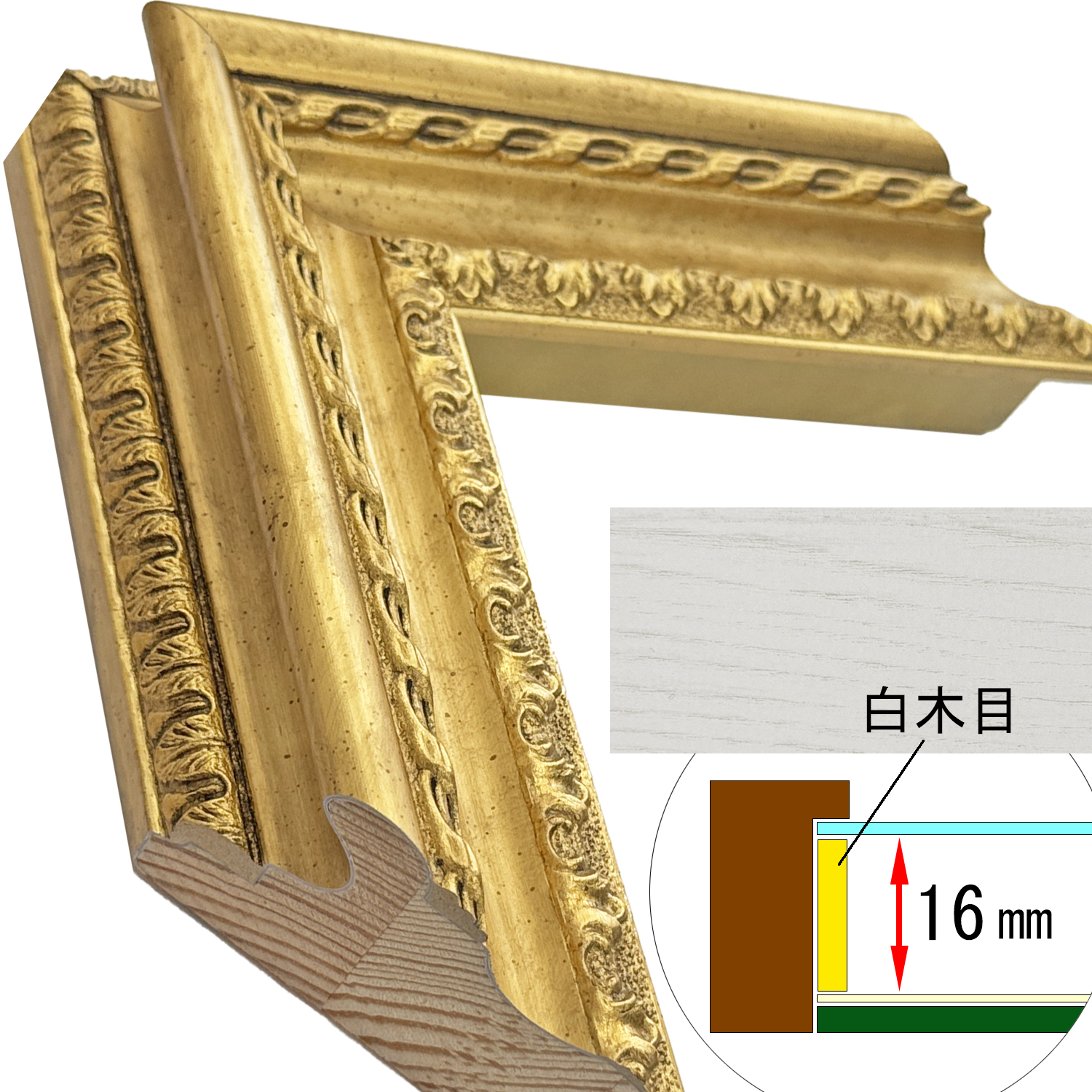 このフレームは「フレーム深さを活かした立体額」の製作も可能です。上の画像では、「フレーム深さを活かした立体額」を製作した場合の、額縁内部深さや深さを支えるパーツの色も紹介しておりますが、オーダーフレームの仕様によって額縁の構造は変わりますのでご注意ください。
