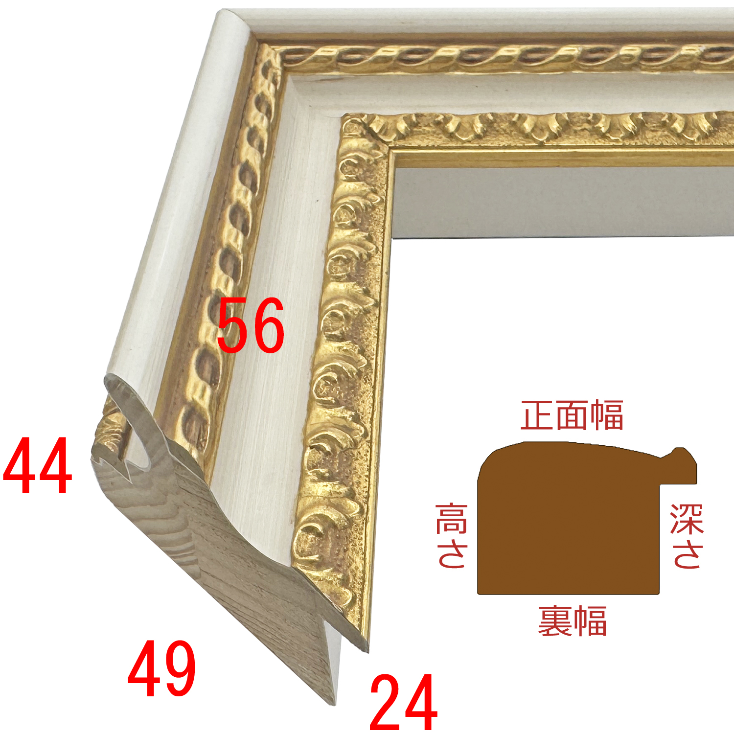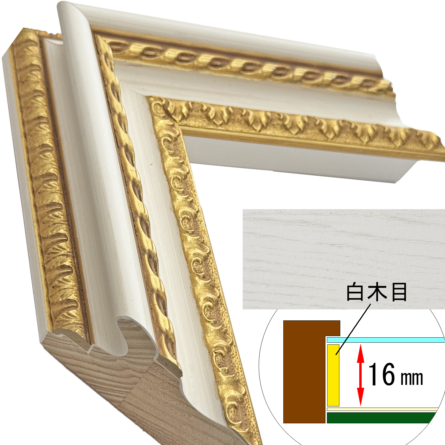 このフレームは「フレーム深さを活かした立体額」の製作も可能です。上の画像では、「フレーム深さを活かした立体額」を製作した場合の、額縁内部深さや深さを支えるパーツの色も紹介しておりますが、オーダーフレームの仕様によって額縁の構造は変わりますのでご注意ください。