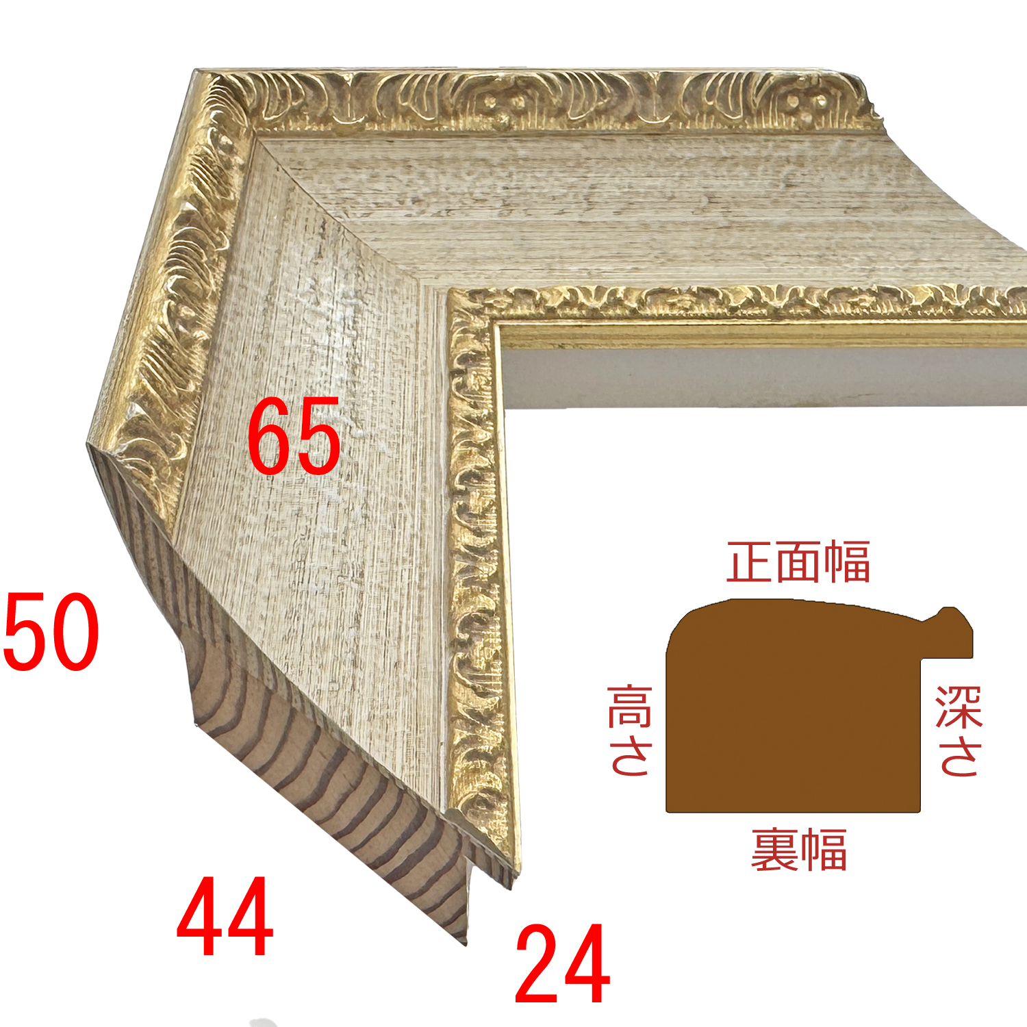 モミ材のオーダーフレーム、外側にぐっと盛り上がったエッジに施された繊細な装飾が美しい