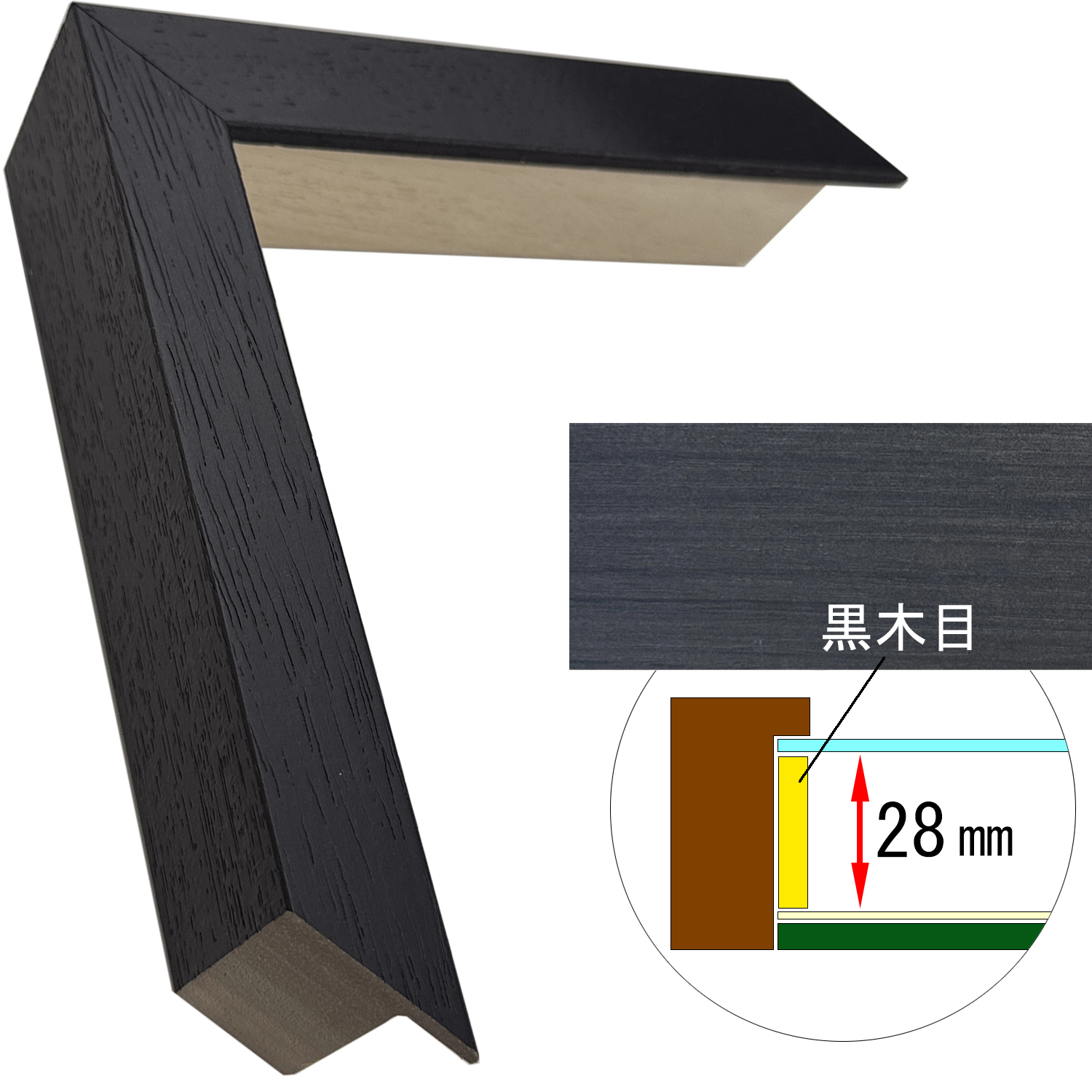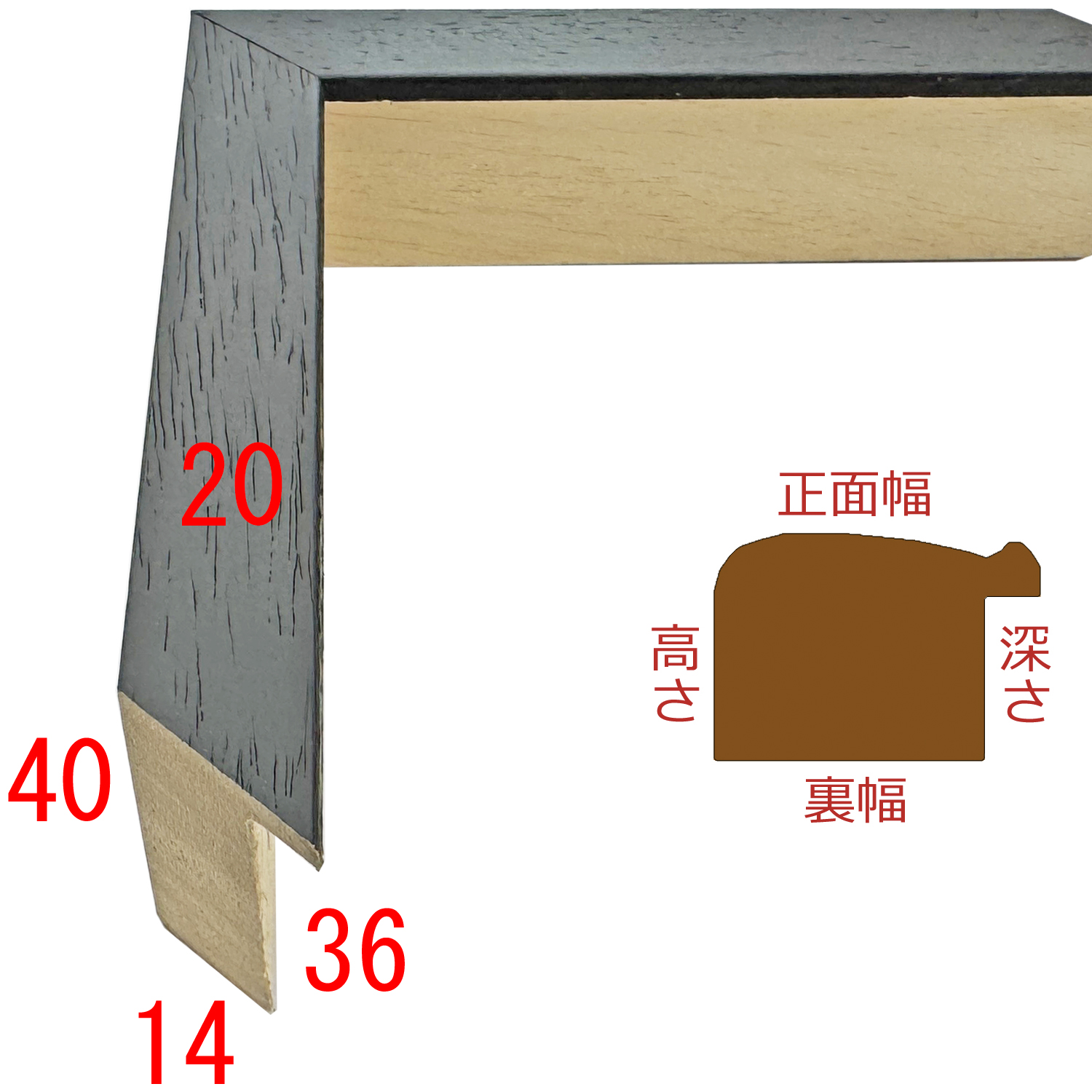 このフレームは「フレーム深さを活かした立体額」の製作も可能です。上の画像では、「フレーム深さを活かした立体額」を製作した場合の、額縁内部深さや深さを支えるパーツの色も紹介しておりますが、オーダーフレームの仕様によって額縁の構造は変わりますのでご注意ください。