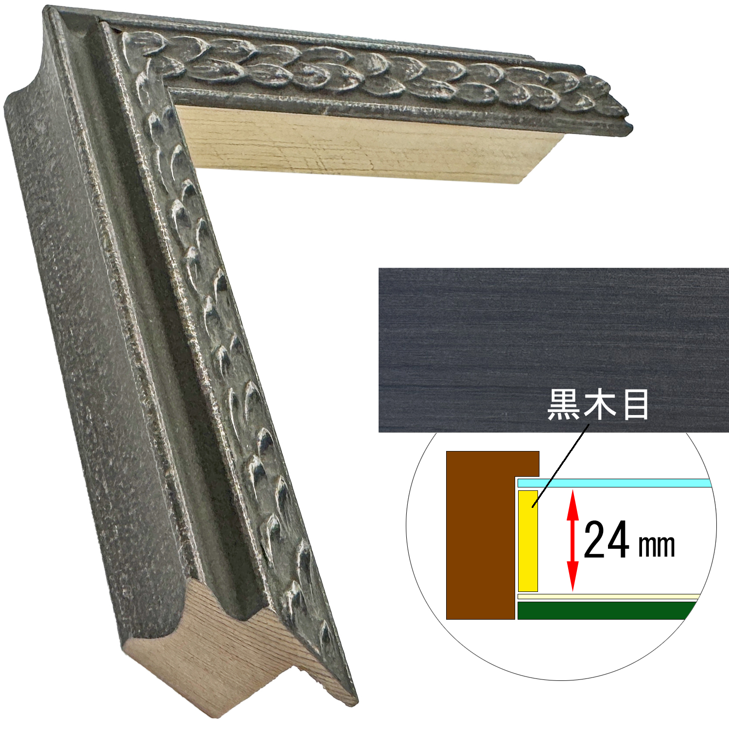 このフレームは「フレーム深さを活かした立体額」の製作も可能です。上の画像では、「フレーム深さを活かした立体額」を製作した場合の、額縁内部深さや深さを支えるパーツの色も紹介しておりますが、オーダーフレームの仕様によって額縁の構造は変わりますのでご注意ください。