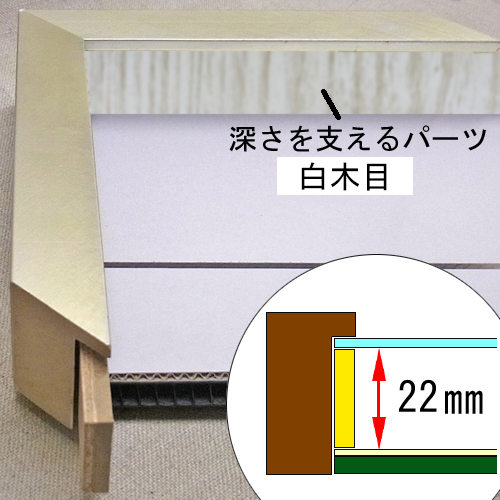 このフレームは「フレーム深さを活かした立体額」の製作も可能です。上の画像では、「フレーム深さを活かした立体額」を製作した場合の、額縁内部深さや深さを支えるパーツの色も紹介しておりますが、オーダーフレームの仕様によって額縁の構造は変わりますのでご注意ください。