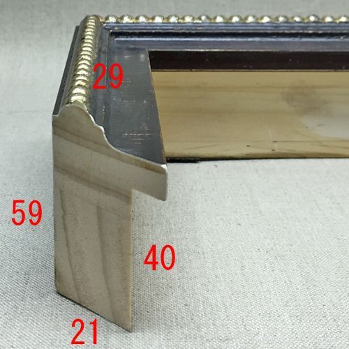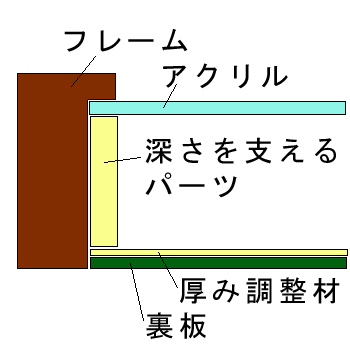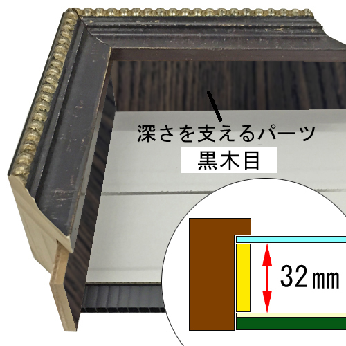 このフレームは「フレーム深さを活かした立体額」の製作も可能です。上の画像では、「フレーム深さを活かした立体額」を製作した場合の、額縁内部深さや深さを支えるパーツの色も紹介しておりますが、オーダーフレームの仕様によって額縁の構造は変わりますのでご注意ください。