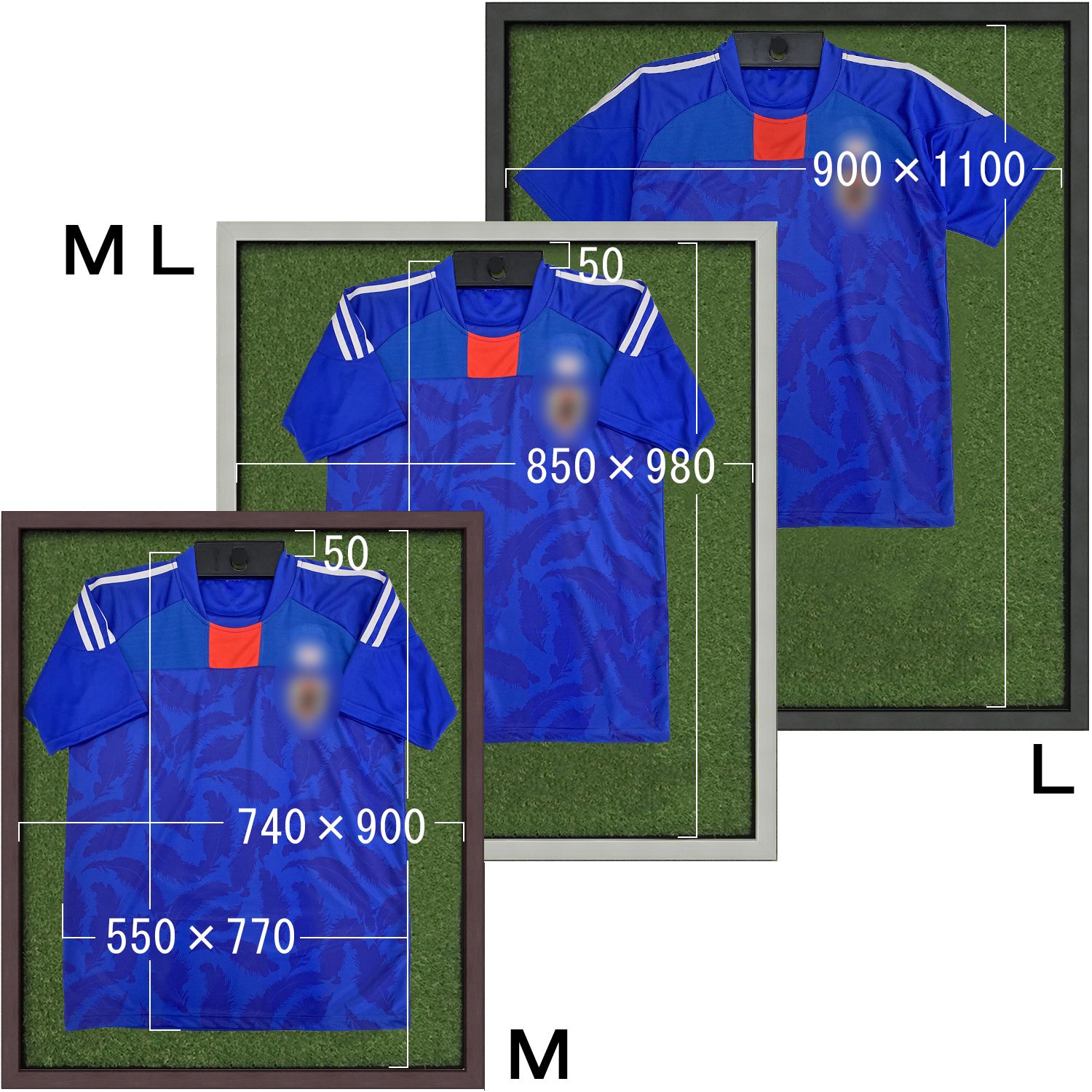 ユニフォームのサイズ表記がMでも、額縁もMサイズとは限りません。競技によってもサイズが大きく異なります。 実際にお手元のユニフォームを広げて、額縁サイズと比べてください。袖を折り返すなど、額縁の中で微調整も可能です。