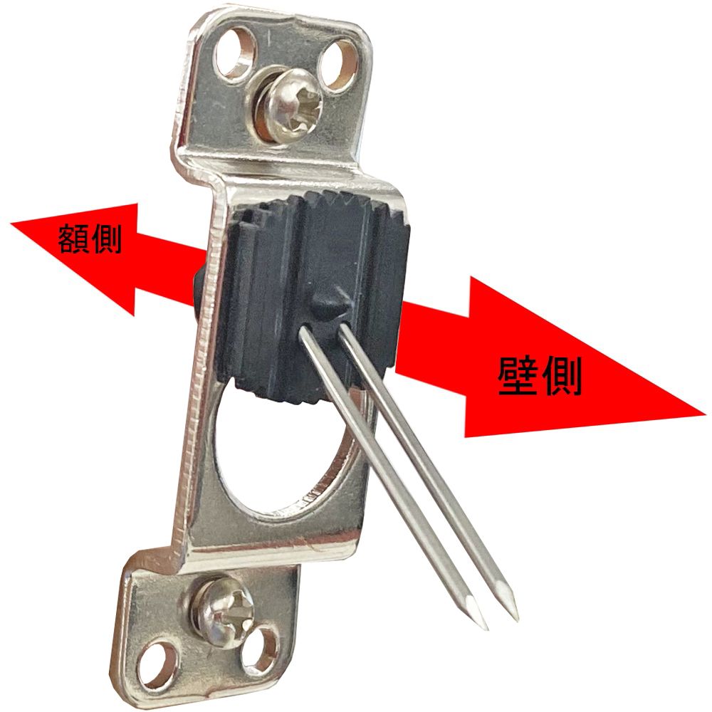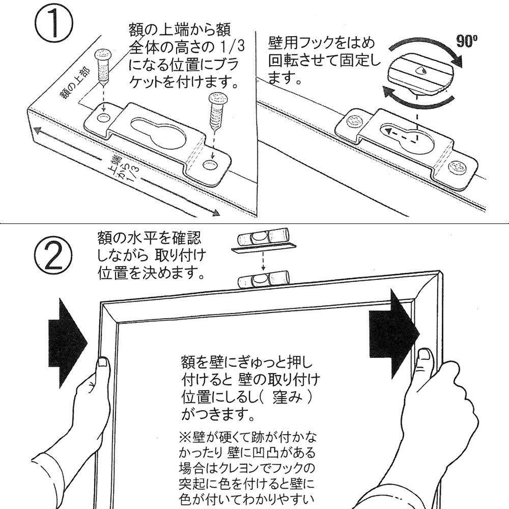 額縁をがっちりと固定する額飾り金具。額縁を水平に、平行に飾れます。