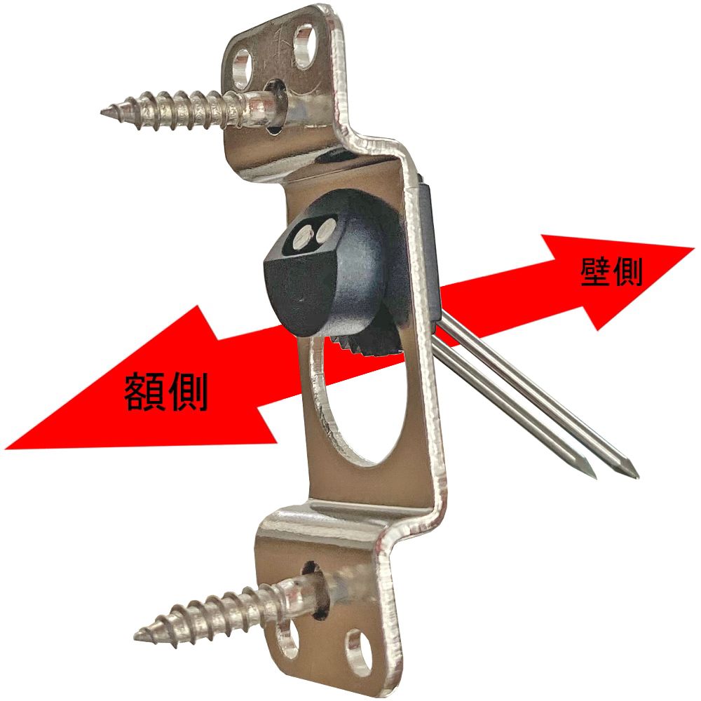 額縁をがっちりと固定する額飾り金具。額縁を水平に、平行に飾れます。