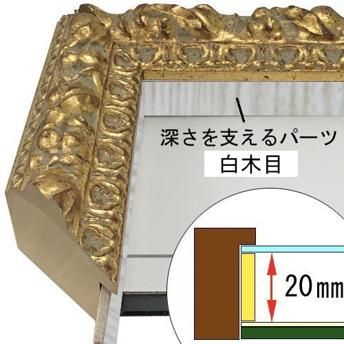 このフレームは「フレーム深さを活かした立体額」の製作も可能です。上の画像では、「フレーム深さを活かした立体額」を製作した場合の、額縁内部深さや深さを支えるパーツの色も紹介しておりますが、オーダーフレームの仕様によって額縁の構造は変わりますのでご注意ください。