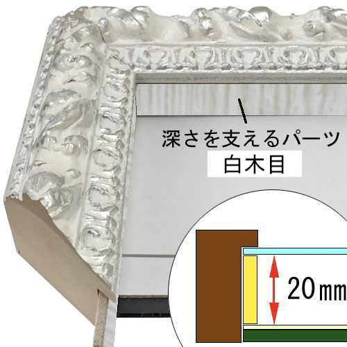 木製(アユース材)、オーダー製作専用フレーム。銀箔とホワイトが上品な豪華さを演出します。