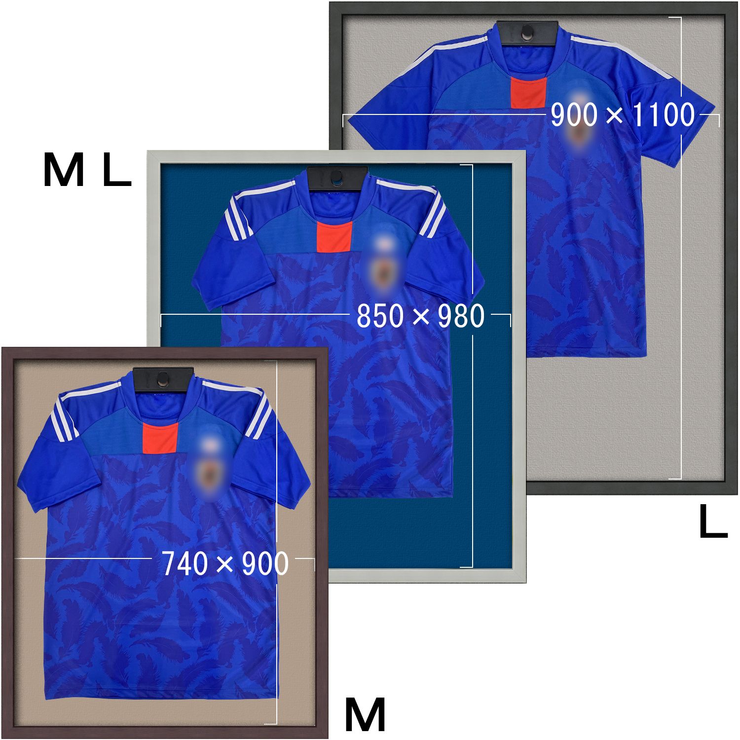 ユニフォームのサイズ表記がMでも、額縁もMサイズとは限りません。競技によってもサイズが大きく異なります。 実際にお手元のユニフォームを広げて、額縁サイズと比べてください。袖を折り返すなど、額縁の中で微調整も可能です。