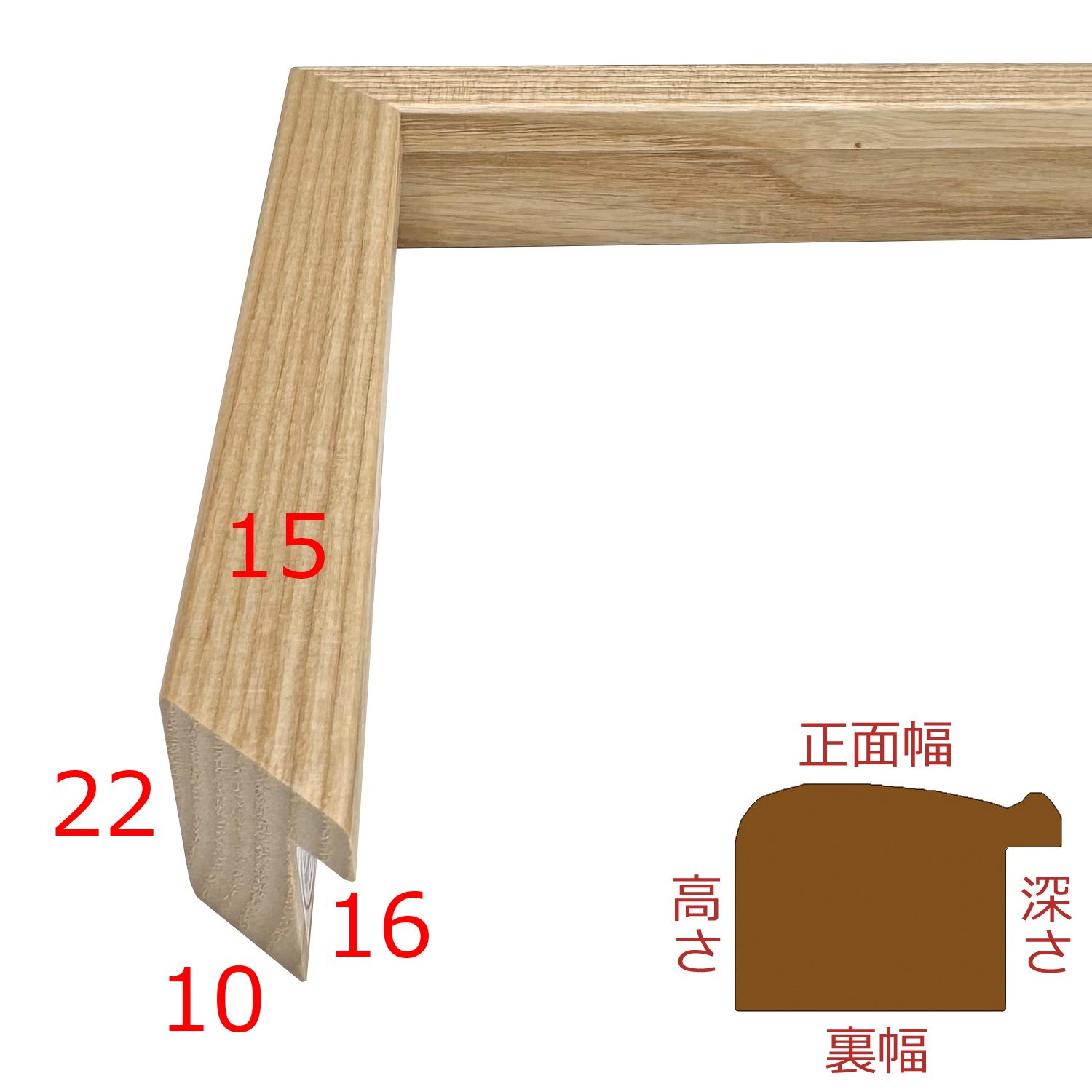 木製、オーダー製作専用フレーム。アッシュ材で作るシンプルな平角の額縁です。アッシュならではの力強い木目が楽しめます。天然木のため、節目や色むらはご容赦ください。