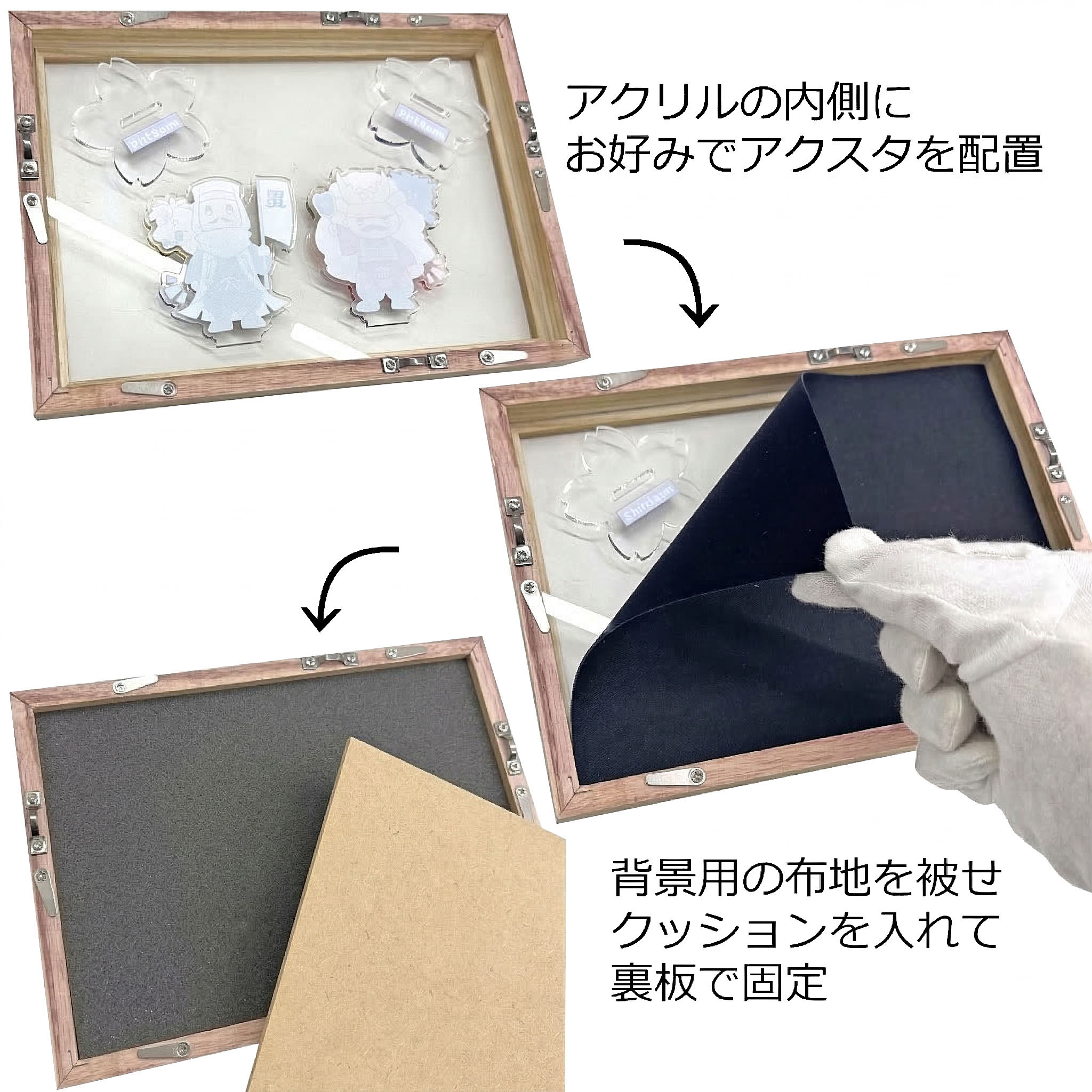 アクリルスタンドを飾れるクッション付きの額縁です