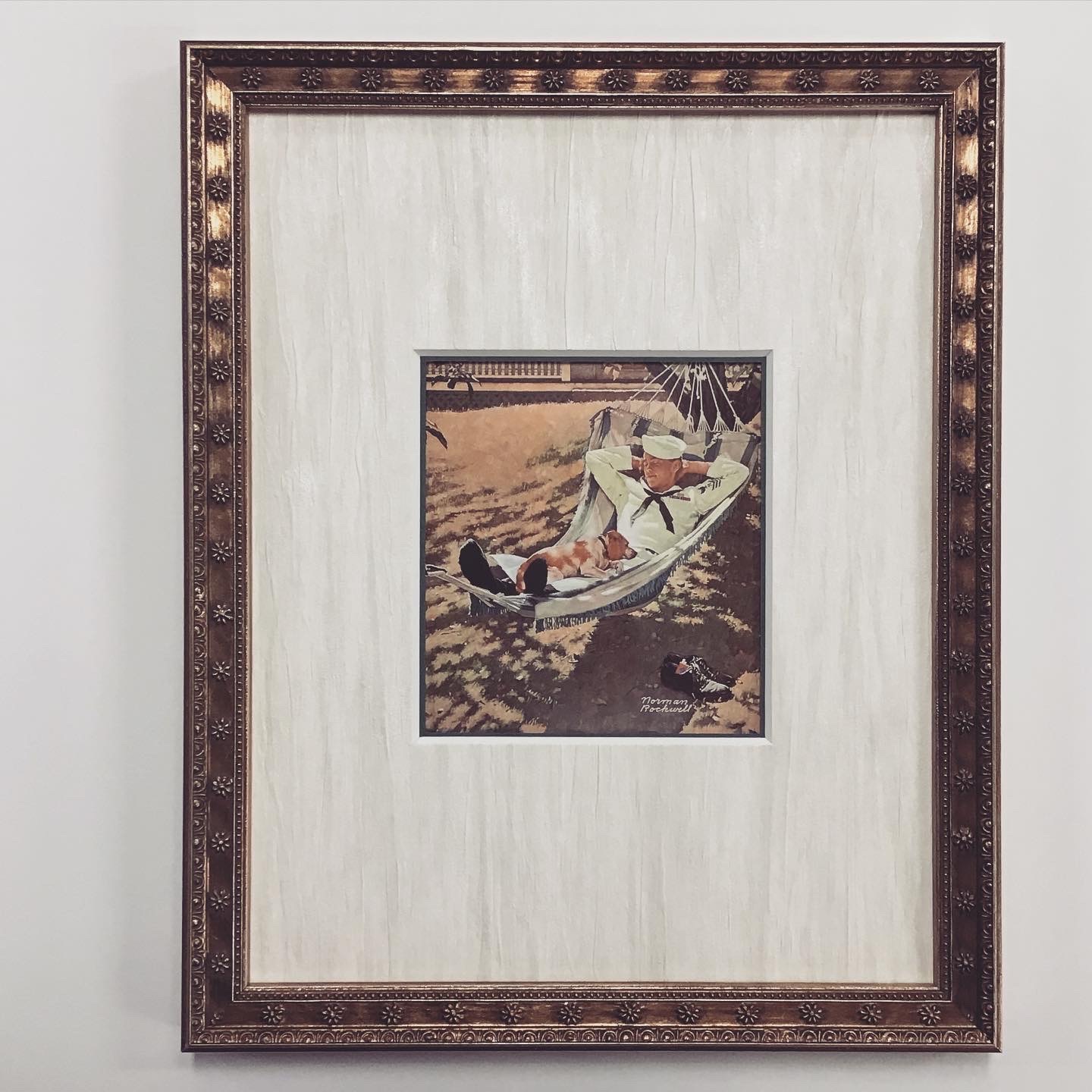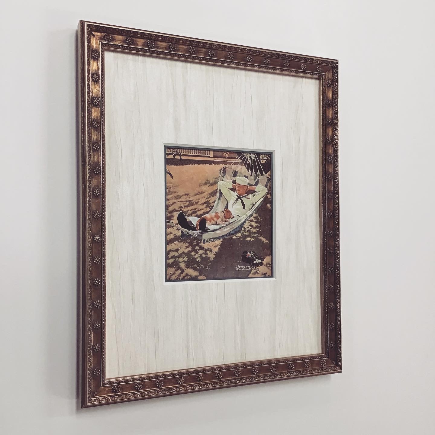 ポストカードを額装しました! 通常のポストカードに比べて、長手が短いポストカードです。 木目っぽい模様の入った壁紙を使用した白いマット(販売なし)に黒色マットをチラッと見せたWマットにしました!