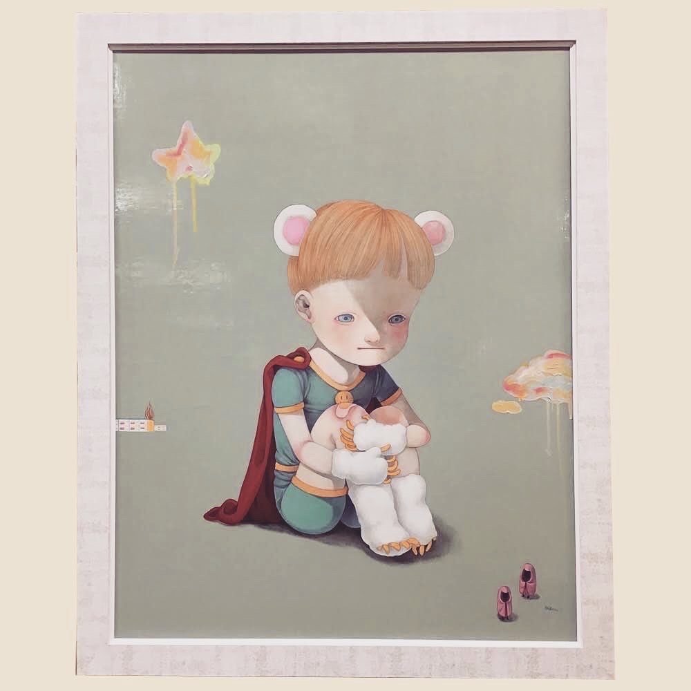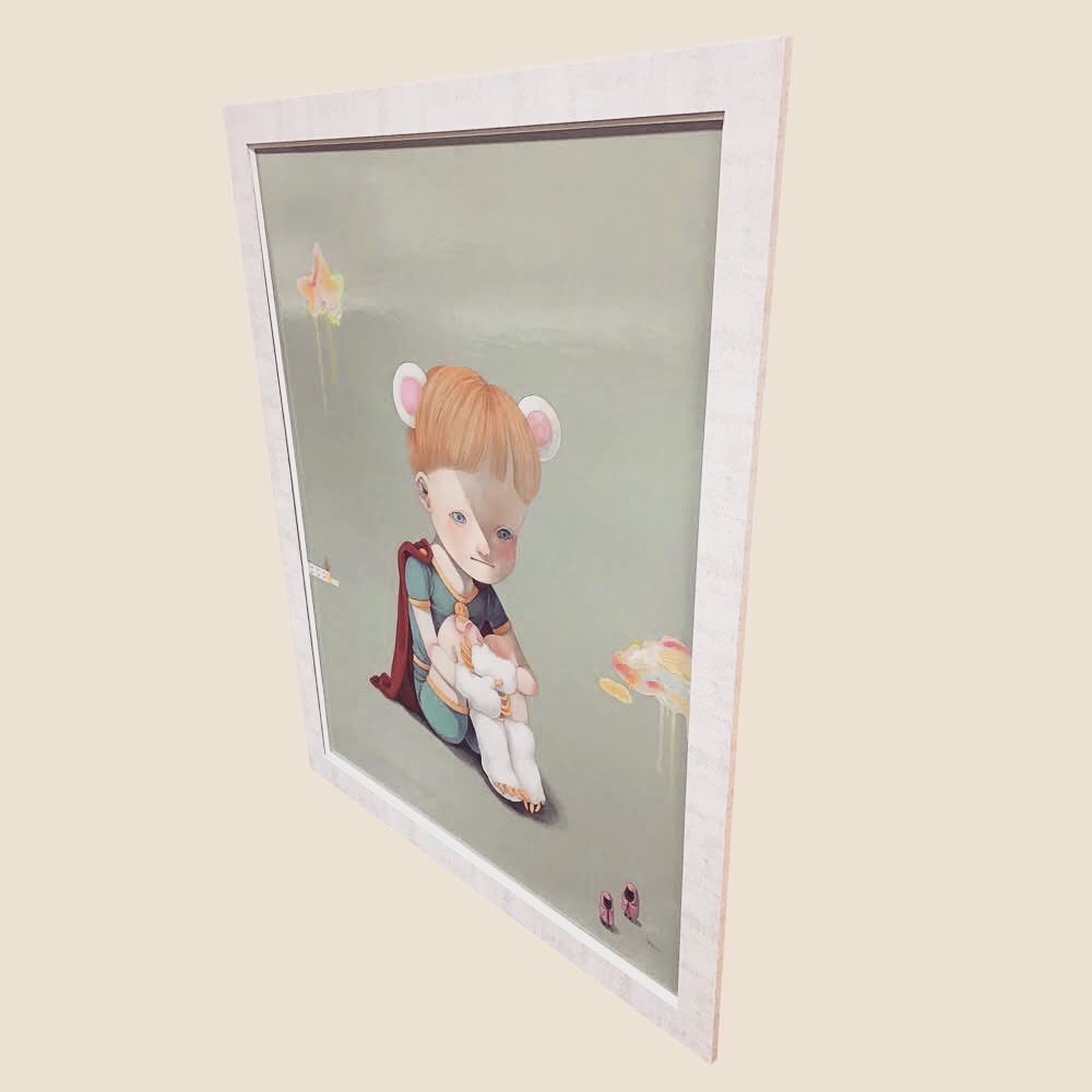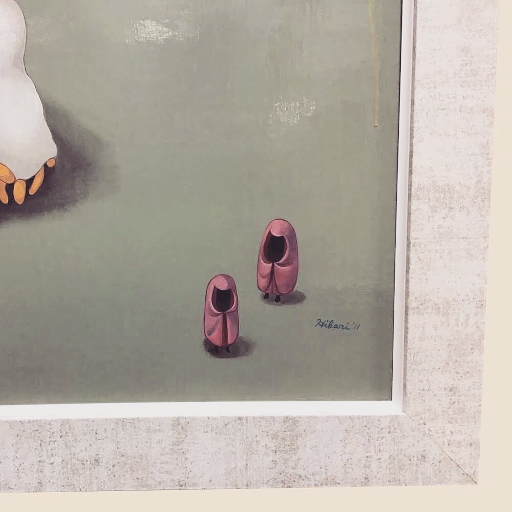 長野県出身の現代アーティスト下田ひかりさん作「ロンリーヒーロー」を額装しました!可愛いイラストチックな中にほんのり薄暗さを感じる作品です。 下田ひかりさんは、10〜20代の若い方を中心に、ネットを通じて国内外にファンが多くいるアーティストさんです! 作品寸法はF50サイズ(909mm×1167mm)です。 ザラザラとした仕上げが特徴的な白いフレーム「D-49322」で製作しました!