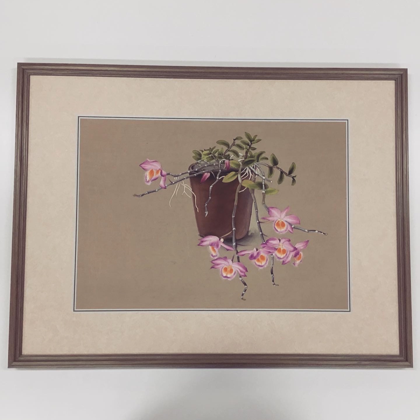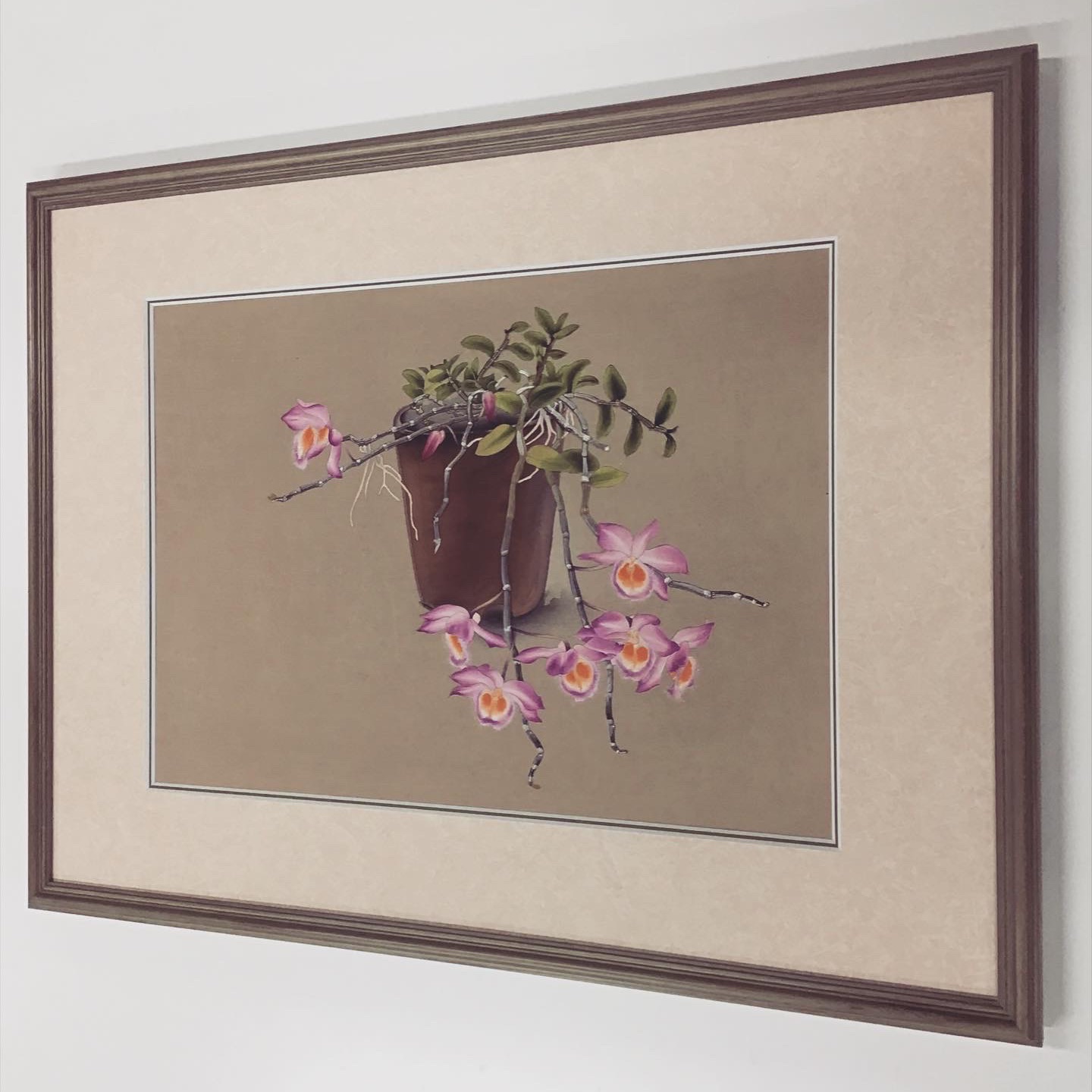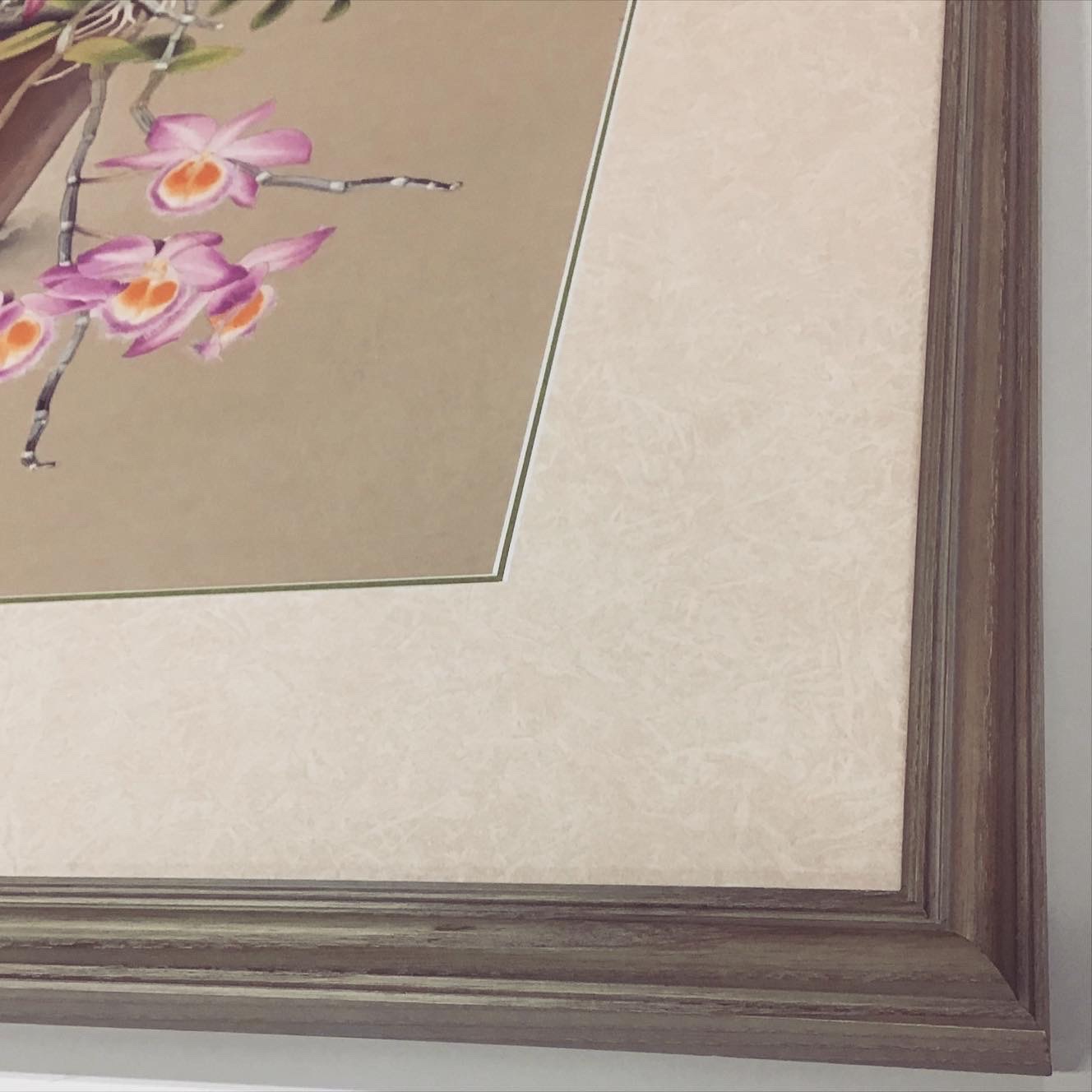 蘭花譜No.47「DENDROBIUM LODDIGESII(デンドロビウム・ロッディギシー)」を額装しました! 使用したフレームは落ち着いたグリーンのフレーム、マットは少し模様のあるベージュ色マット(20102)と明るい緑色マット(10463)のWマットです。
