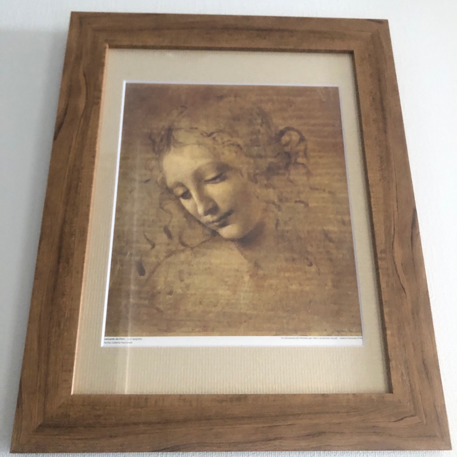 レオナルドダヴィンチ氏の「ほつれ髪の女」ですね!肌の質感や表情の描写がリアルで、まるで生きているように見えるのは流石です。全体的に同じ色合いでまとまり、フレームやマットの質感が作品ともマッチしてとても素敵な額装になっています🥰