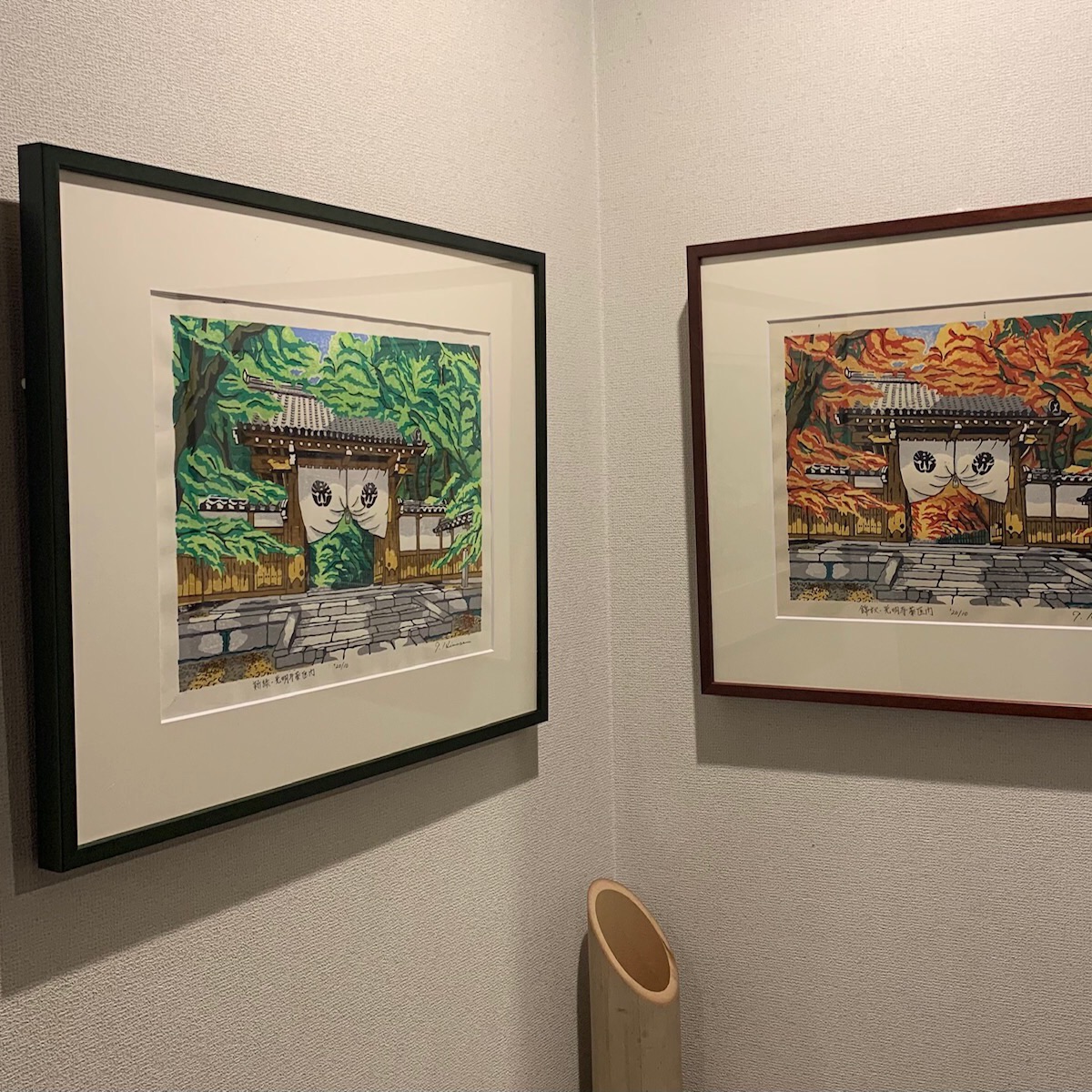 木版画を始めて丸一年、第6作と第7作を額装して廊下に飾りました。地元の光明寺薬医門の新緑と錦秋の佇まいです。