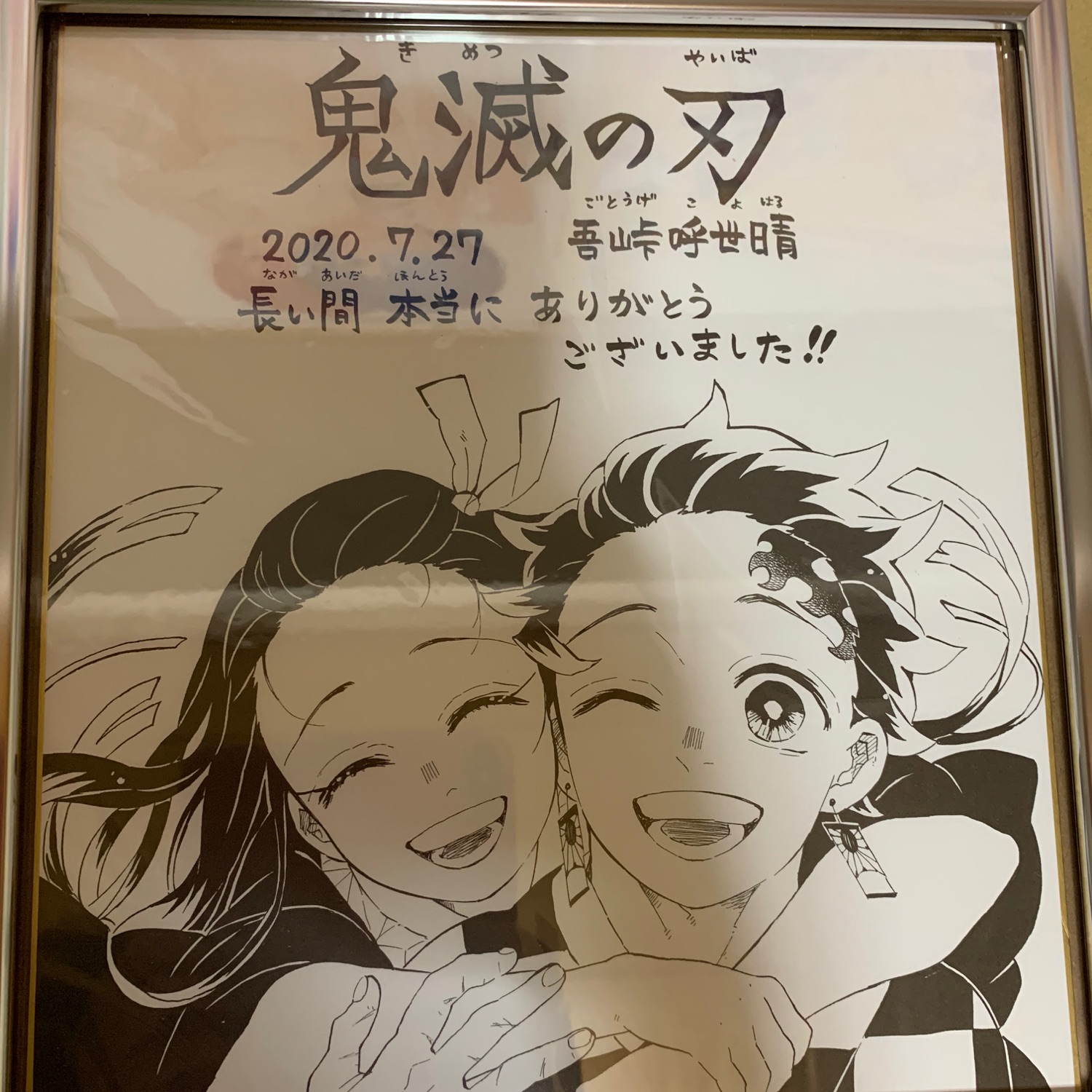鬼滅の刃のサイン入り色紙!😳抽選500名の色紙を手に入れられたんですね🎊ずっと兄妹の歩んできた姿を見てきた読者からすると、なんだか感慨深いイラストです✨アクリル付きなので室内紫外線から保護されますので、大切にお飾りください!