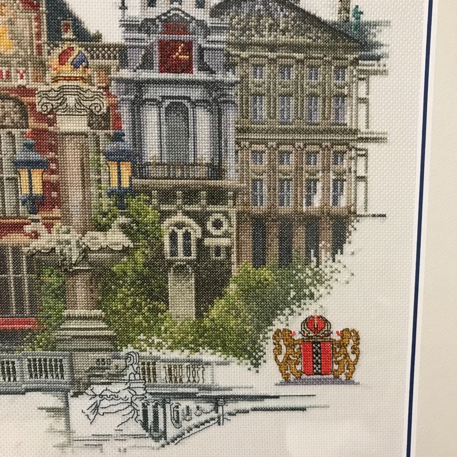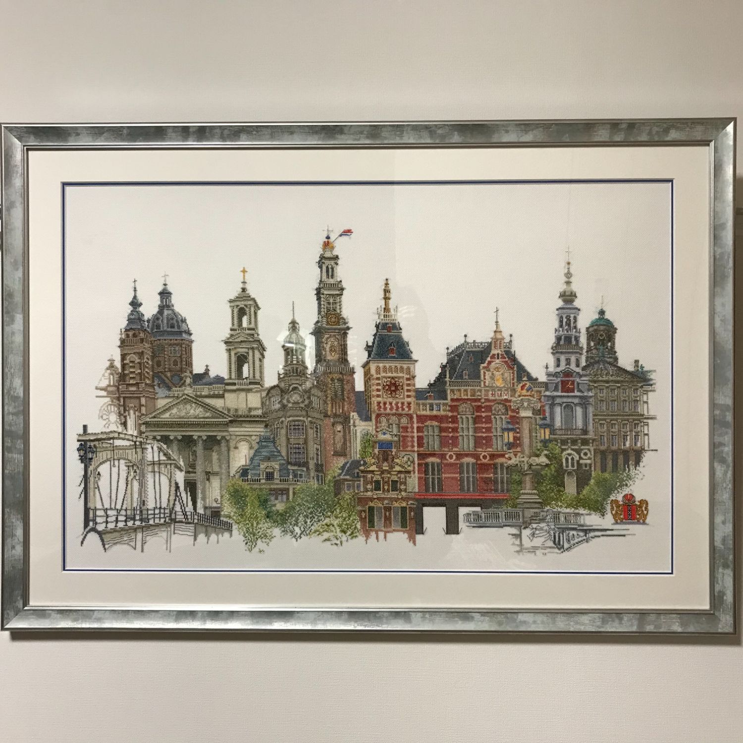 作品が大きく(570×840mm)制作に一年半かかった アムステルダムのクロスステッチ刺繡です。 マット・額縁をすべてお任せし額装していただきました。 額縁のシルバーは上品な輝きがあってとても気に入っています。