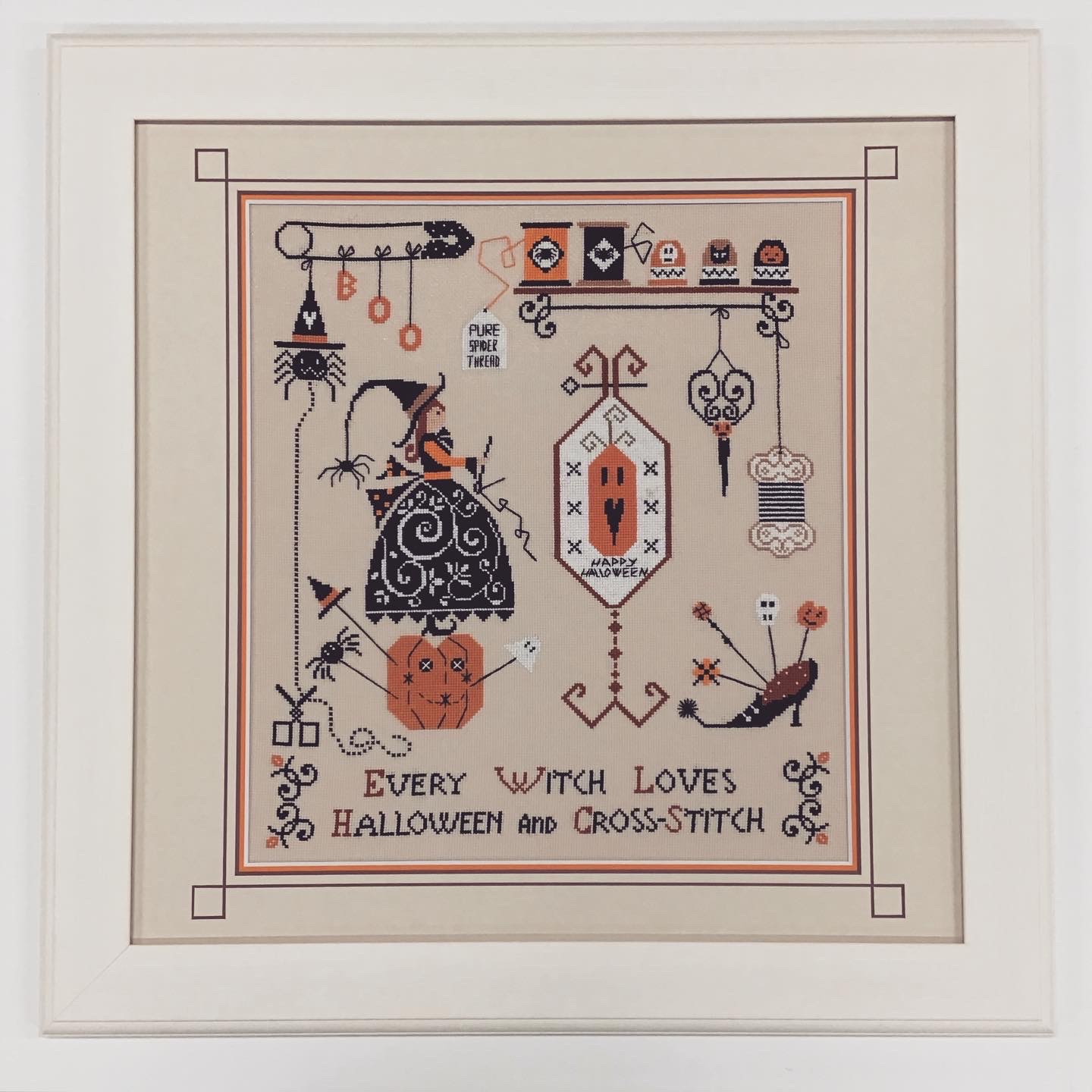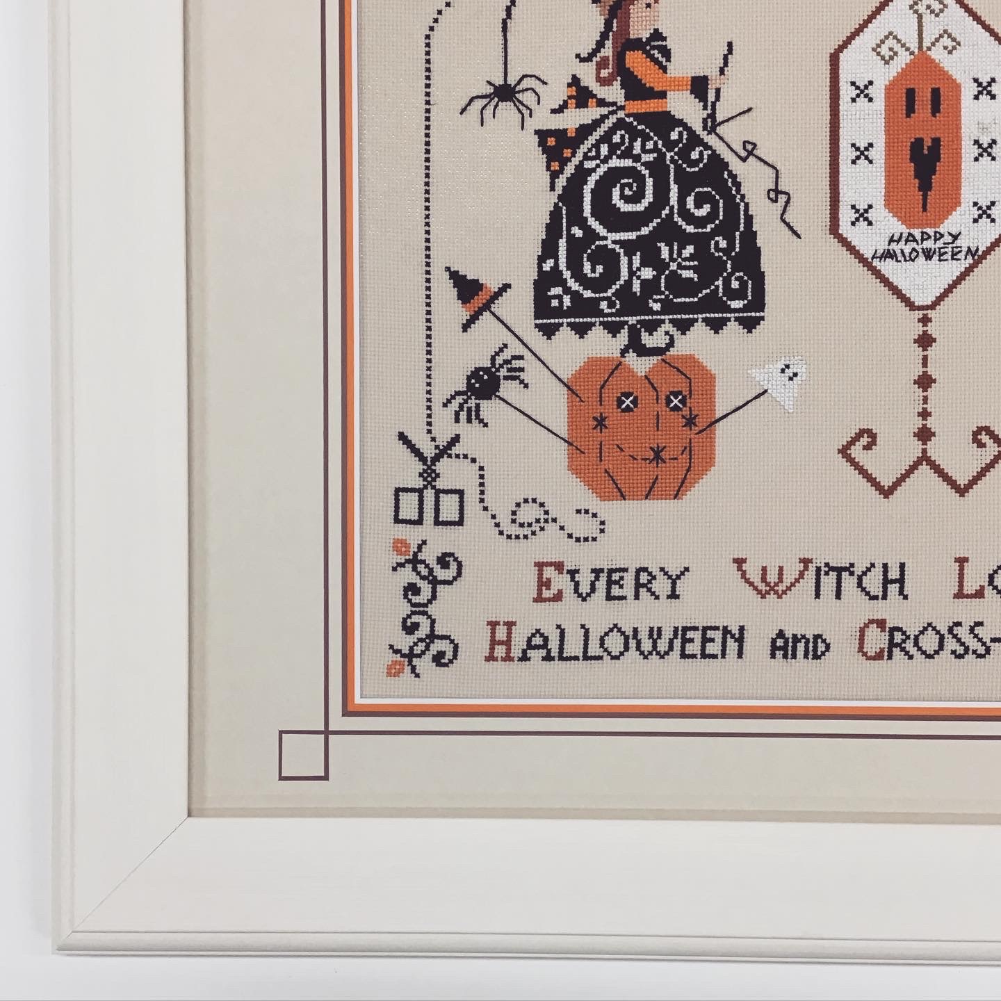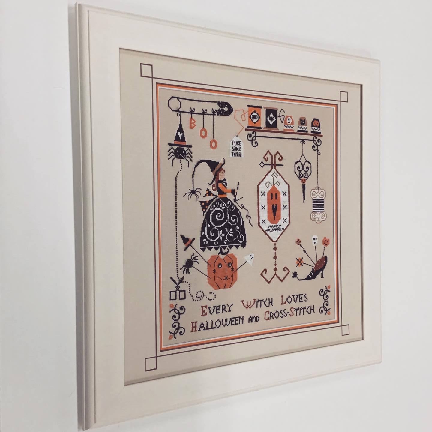 ハロウィンの季節は過ぎてしまいましたが...ハロウィンなクロスステッチ作品を額装しました! 使用したフレームは「APS-01 ホワイト 40角サイズ」、マットは切り口が茶色のベージュ色マット(10197)とオレンジ色マット(10046)のWマットです。V溝加工で表面にデザインを入れました!