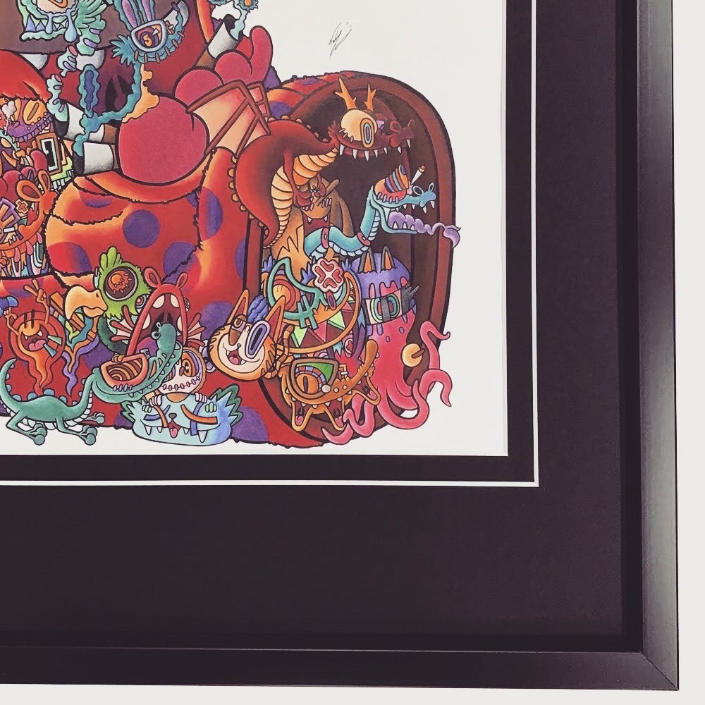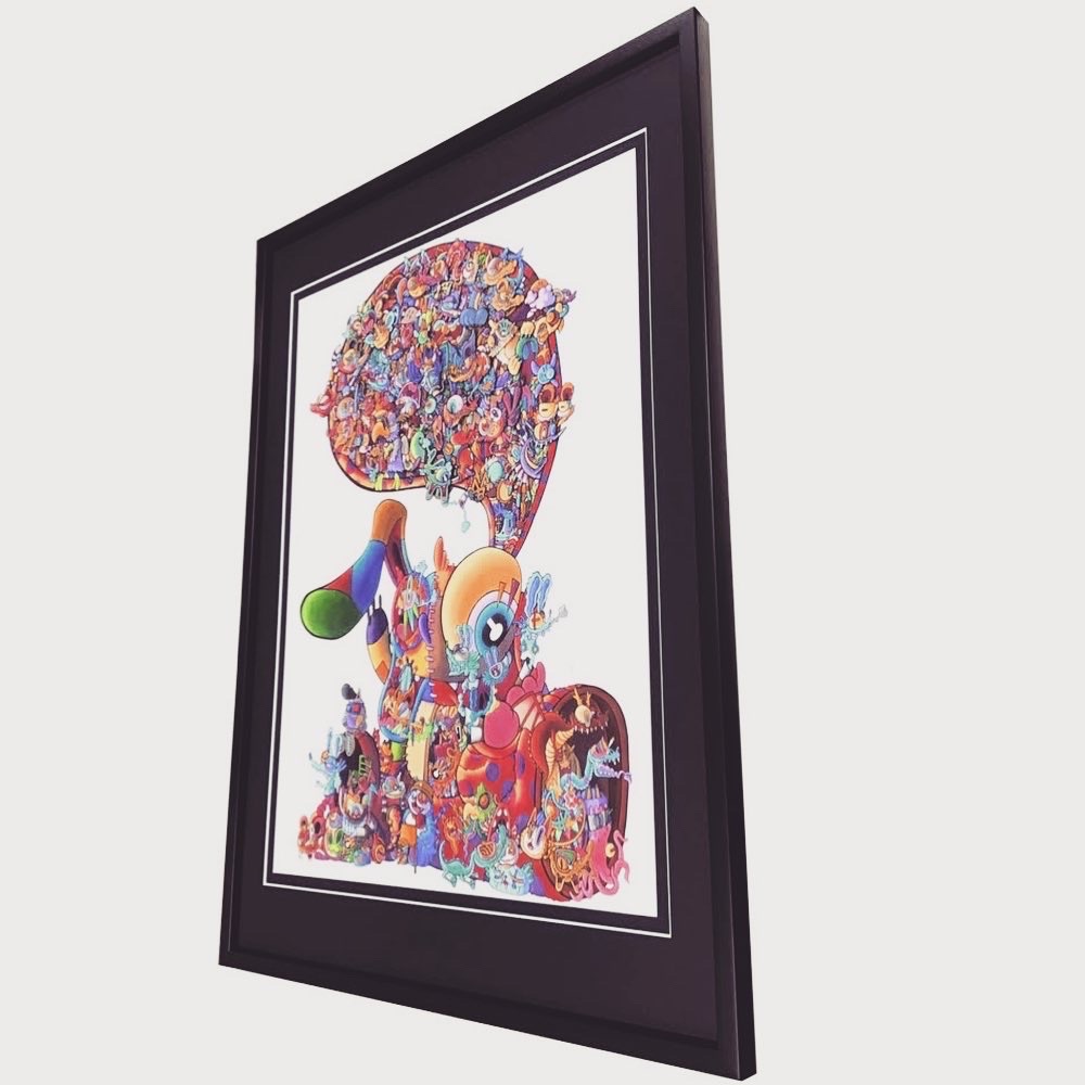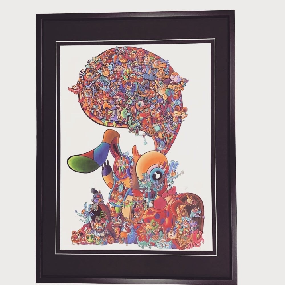 イラストを額装しました! ウサギのようなキャラクターに色んな動物や物が描き込まれています。 写真だとわかりづらいかと思いますが、耳の部分の絵はイラストのひとつひとつが飛び出しています。 使用したフレームは「SG-702N ブラック ジャスト40P(729×1002mm)」、マットは飛び出しているイラストがつぶれないように2 mm厚の黒色マット(20010)を2枚使用したWマットになっています。