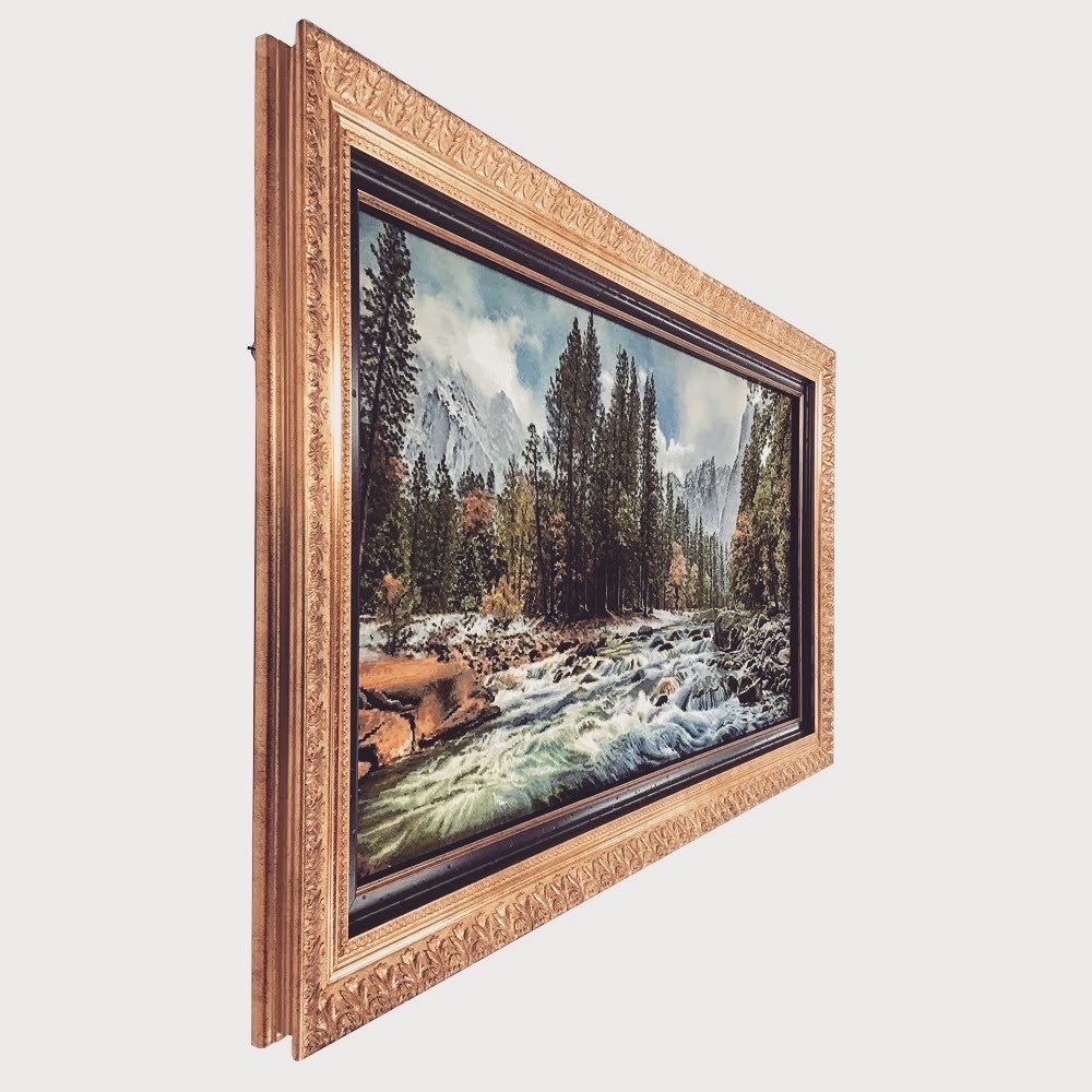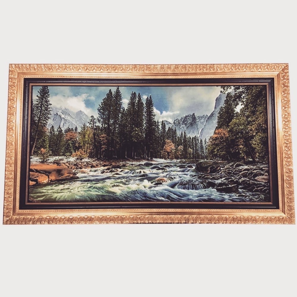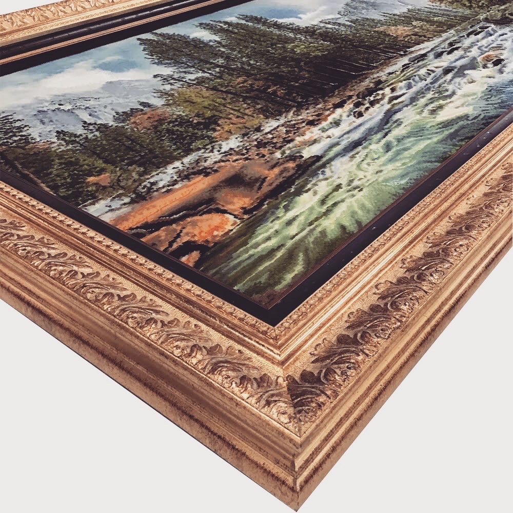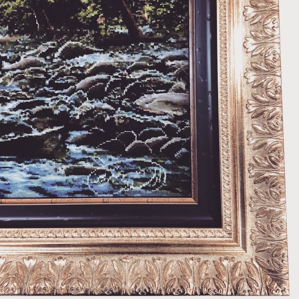 ぱっと見たら油絵に見えますが、実は... 絨毯なんです! 約540mm×1035mmの大きなペルシャ絨毯を額装しました! 外側にゴールドのフレーム「I-45014」、内側はブラウンのフレーム「B-20132」、2種類のフレームを贅沢に使用したオーダー製作品です。 お客様のご希望で、額に入れた後も触って楽しみたいからということで、表面にはアクリルガラスが入っていない仕様になっています。
