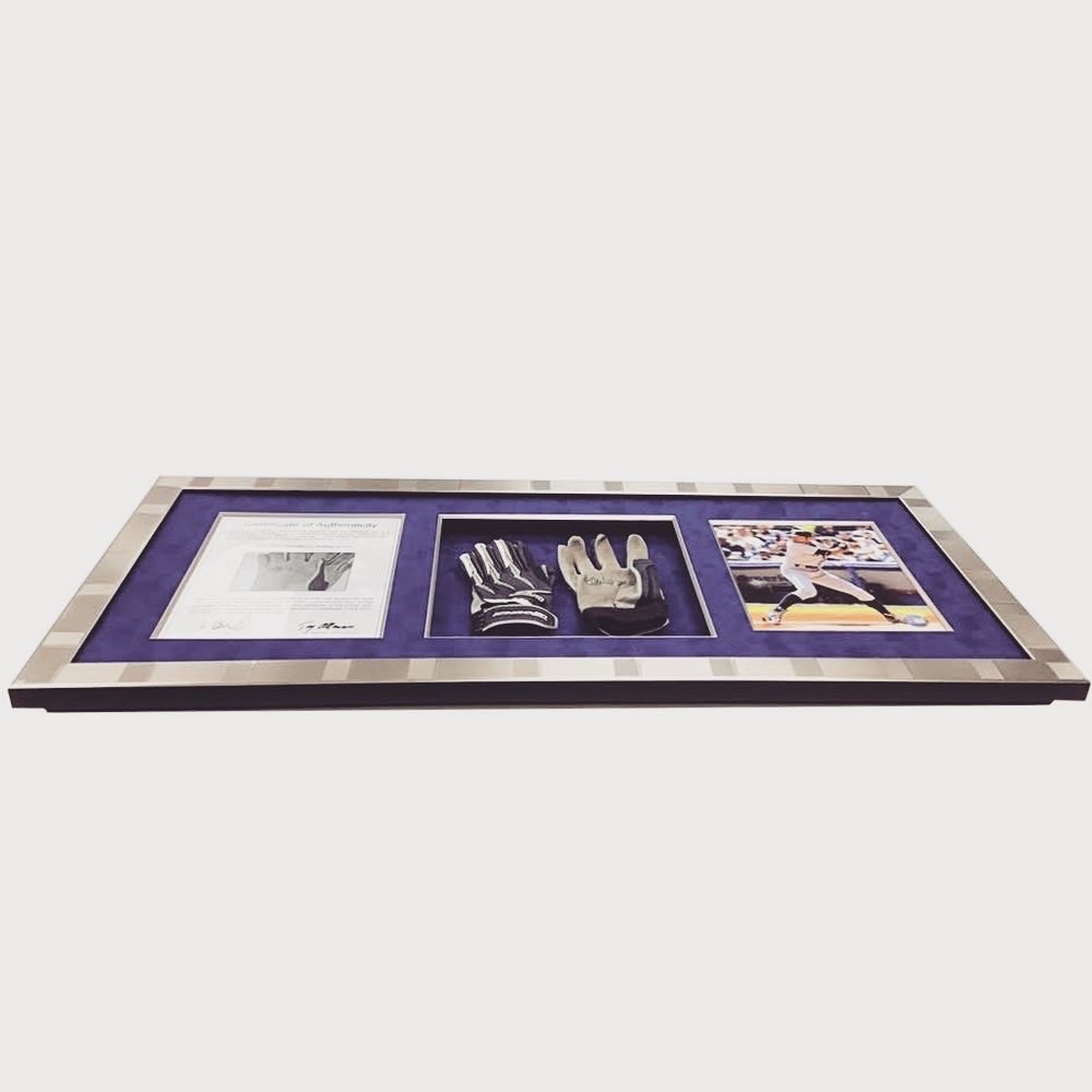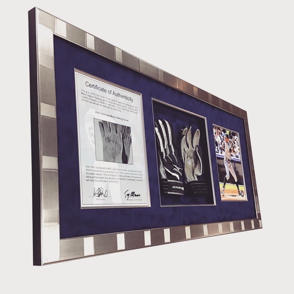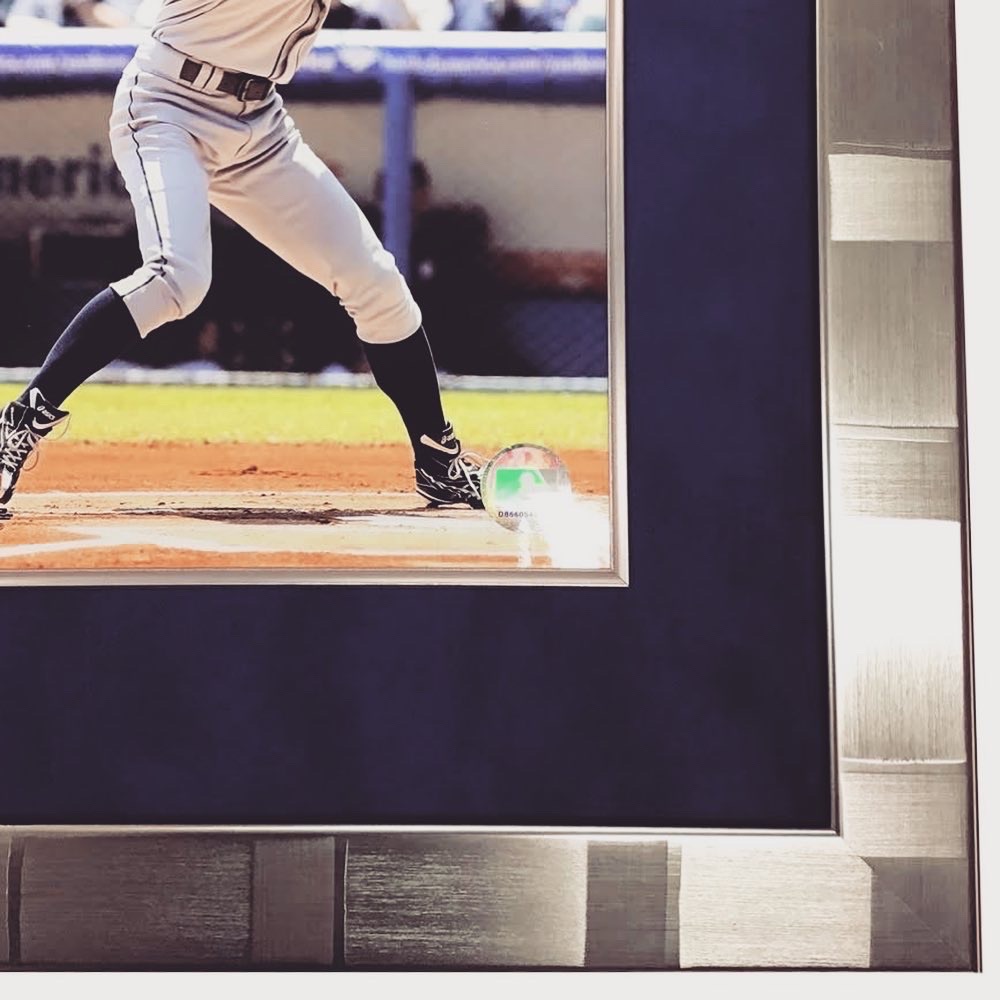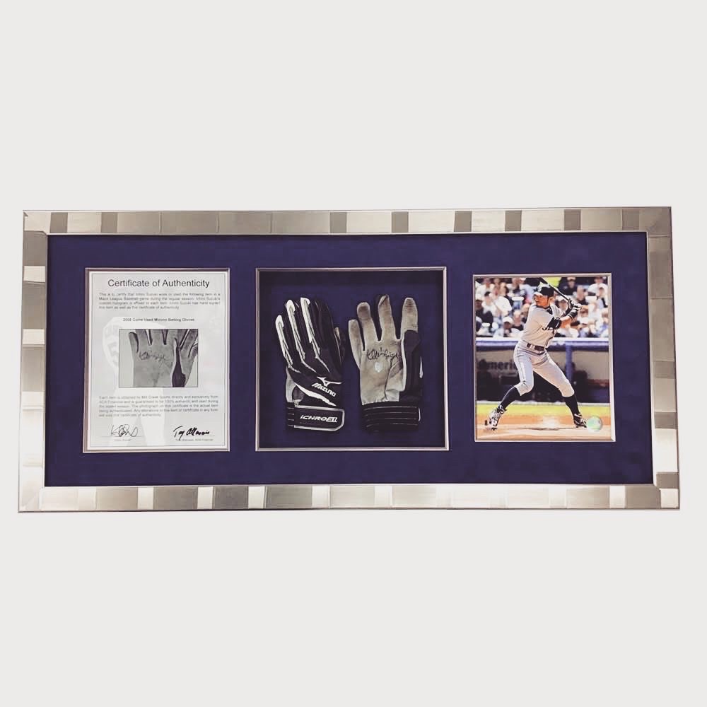 イチロー選手のサイン入りグローブと写真、証明書を額装しました! イチロー選手は日本のみならず世界に名を轟かせた名選手です。引退はしたものの人気が衰えることはありません。 使用したフレームは「10-6050R」、マットはスエードネイビー(24606)に面金(シルバー)加工しました。グローブは背景のマットに縫い付けて固定しています。