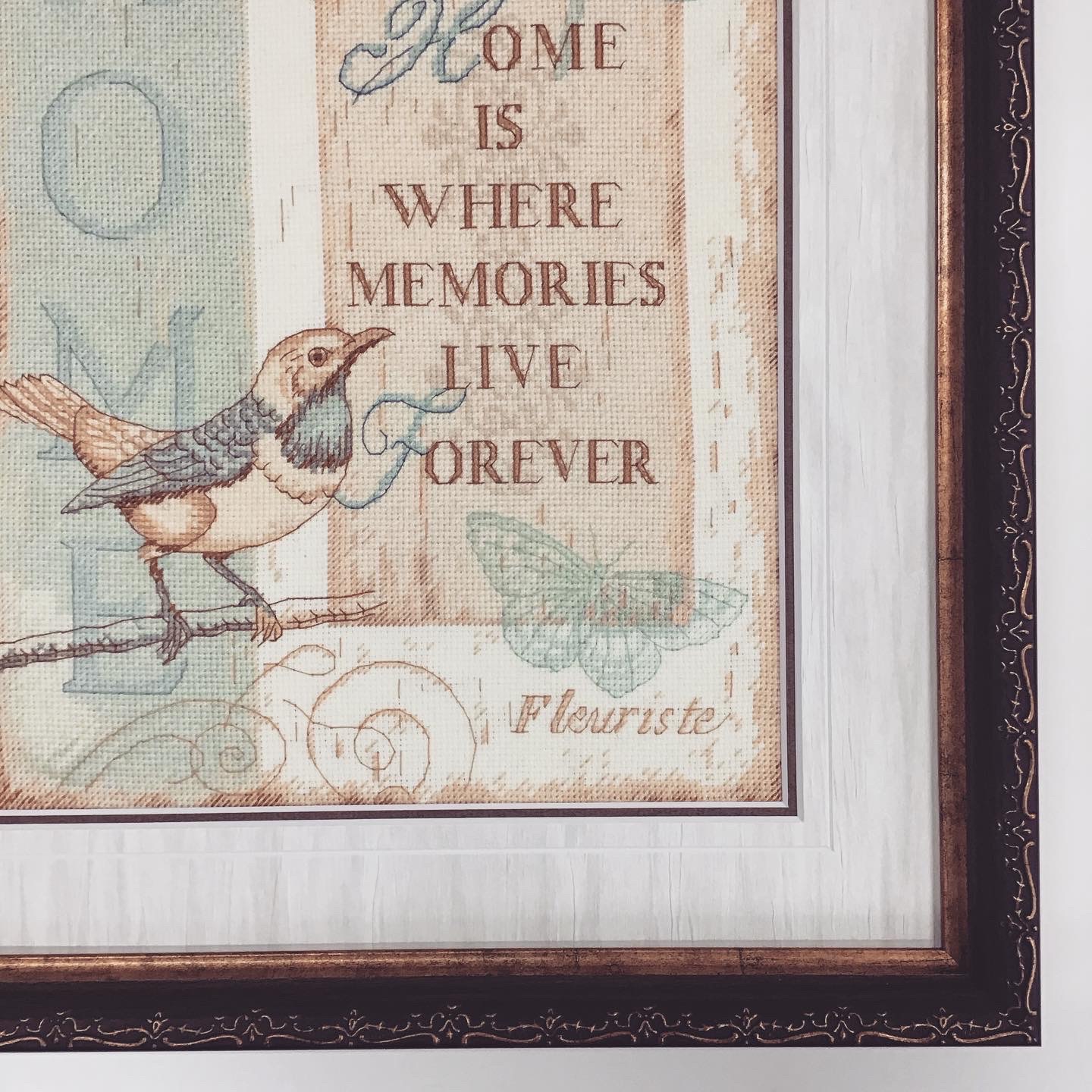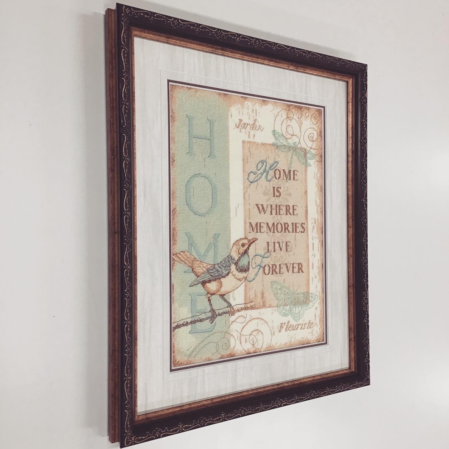 クロスステッチ作品を額装しました!全体的に淡い色合いでオシャレなクロスステッチ作品です。 使用したフレームは「8214 グリーン 四ツサイズ」、マットは木目模様の白色マットと茶色マット(20106)のWマットです。表面にV溝加工を入れました!
