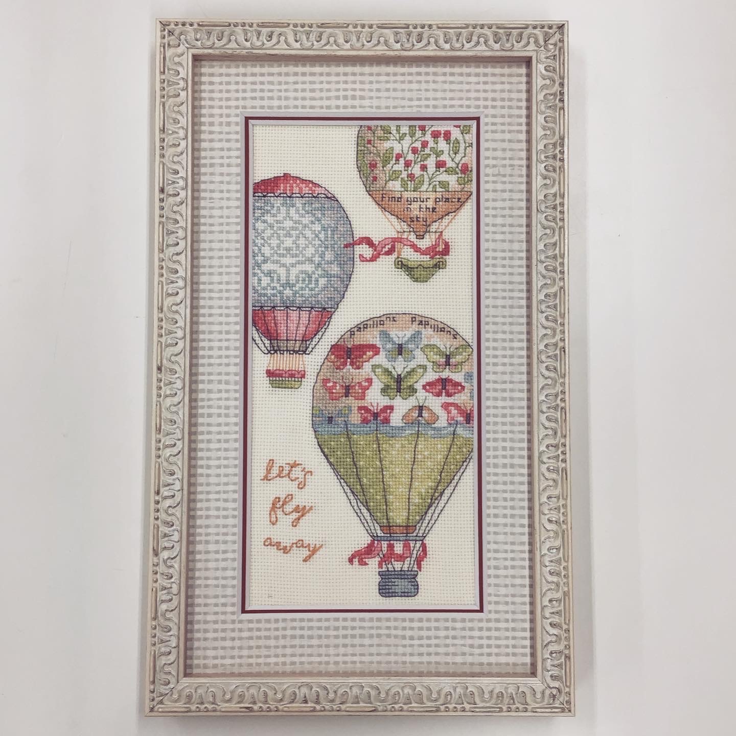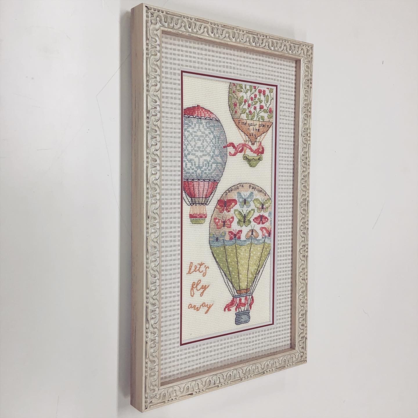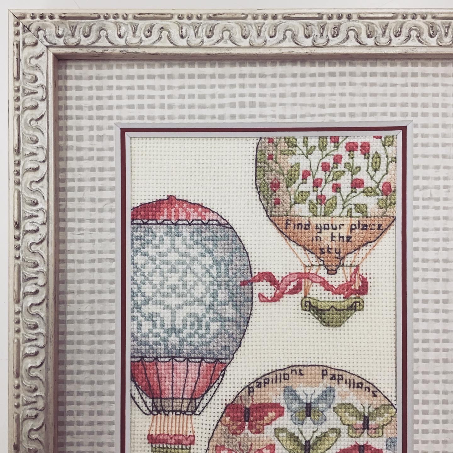クロスステッチ作品を額装しました! カラフルな気球が可愛い作品で、サイズは約100mm×220mmの小さめです。フレームはお客様にお選び頂きましたが、寸法やマットの組み合わせ等は「コンパクトに可愛く」という感じでご依頼いただきました。 使用したフレームは「B-60062」155mm×270mmのオーダー製作で、マットはチェック柄の白色マットと赤色マット(10452)のWマットです。