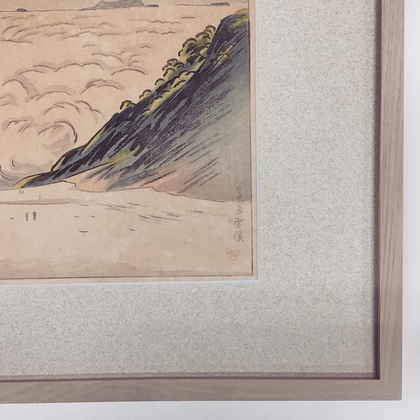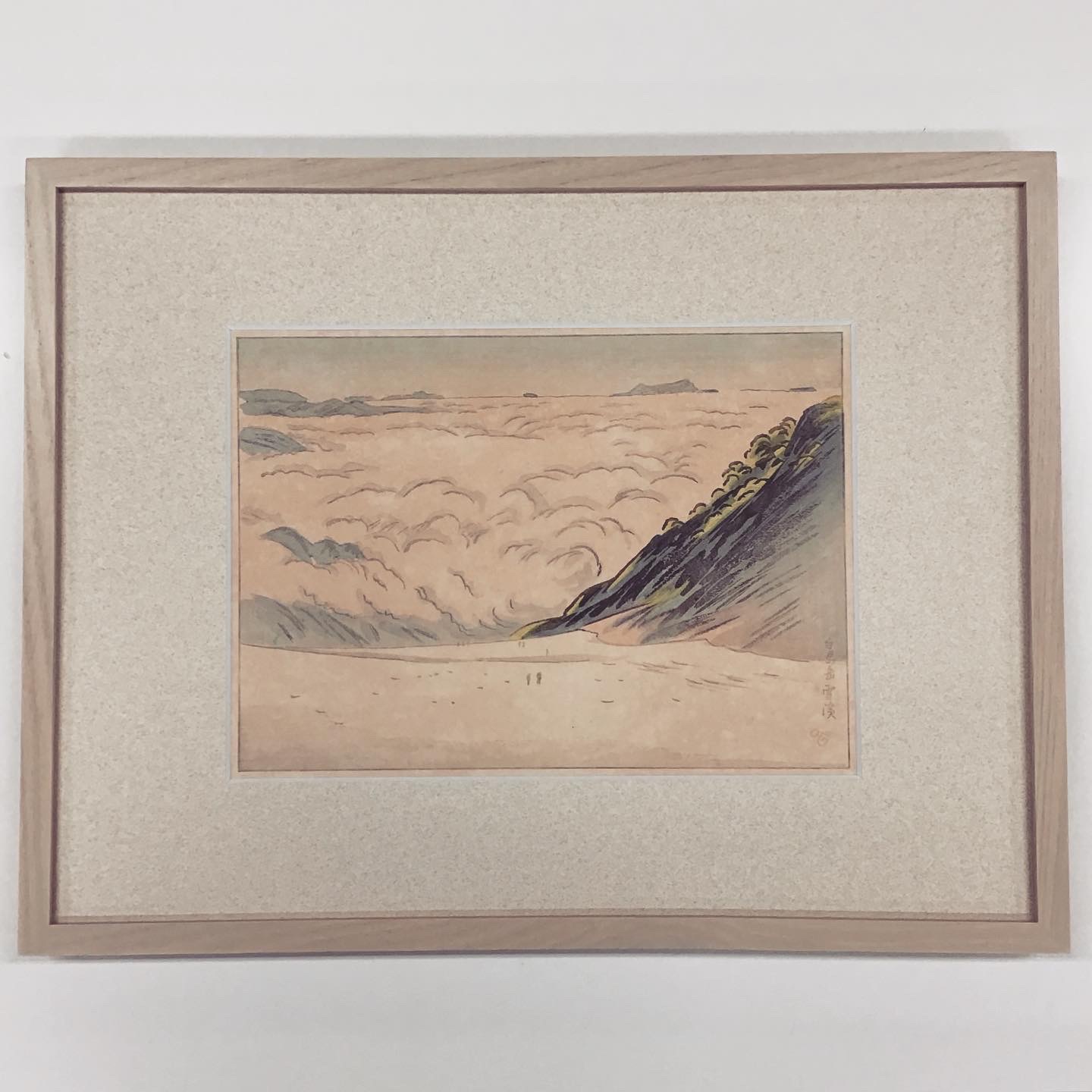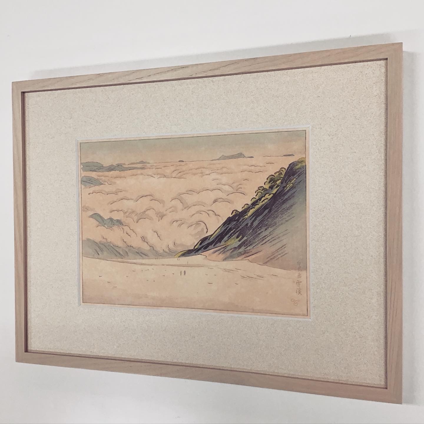 版画を額装しました!右下には「白馬岳 雪渓」と書いてあります。雪の中歩く人と奥には...雲海でしょうか?白い雲が山々を覆っています。 使用したフレームは「9102乳白 太子サイズ」、マットはベージュ色(19002)です。