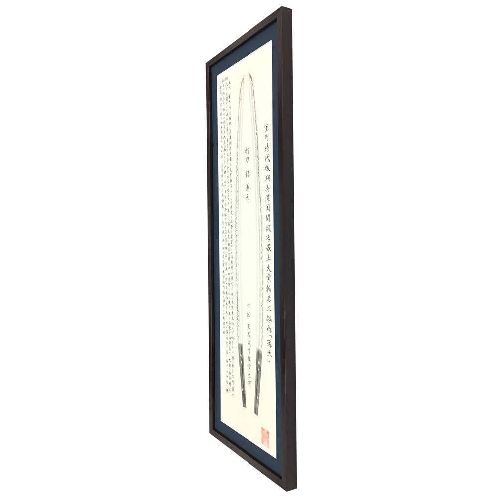 刀剣押形 打刀「孫六」を額装しました!刃紋や銘、「孫六」の寸法や詳細内容などが書かれています。 紙の寸法は約270×1000mm、既製品では大きさが足りないため、オーダーでお作りしました。 使用したフレームは焦茶色の「A-10144」、フレーム内寸は350×1080mmです。 マットは紺色マット(10004)を使用しました。