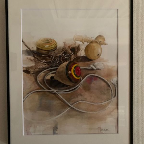 新年を迎え絵画サークルでの課題で設えられた正月に纏わる凧や福笑いなどの中から木製玩具を選び描いてみました。