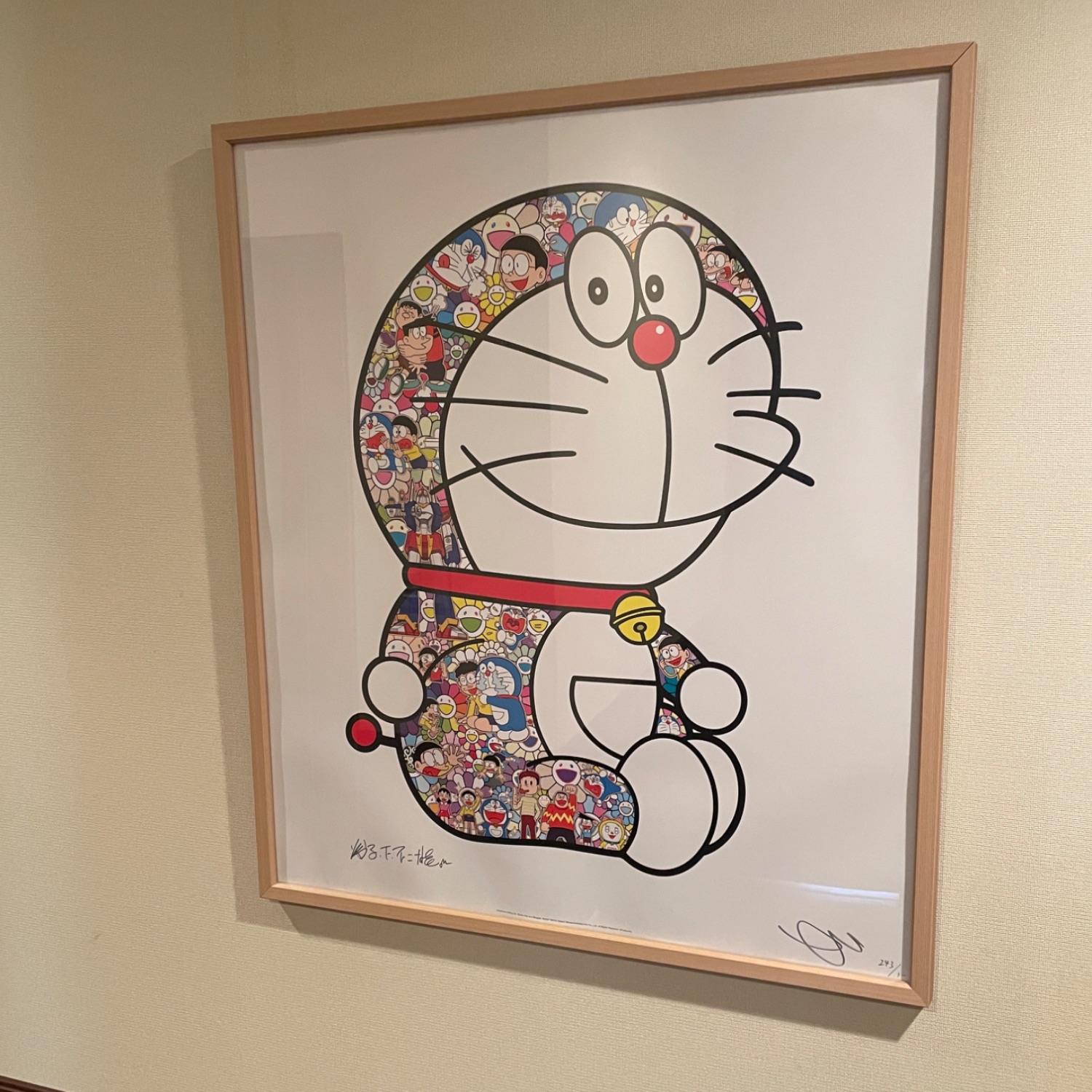 明るめな色のフレームなので、額装されたポスターが際立っていますね。 村上隆のドラえもんはとてもカラフルでポップな作品なのでシンプルなフレームの選択がよかったと思います。 イラストの柔らかい雰囲気が写真を通しても伝わってきます。