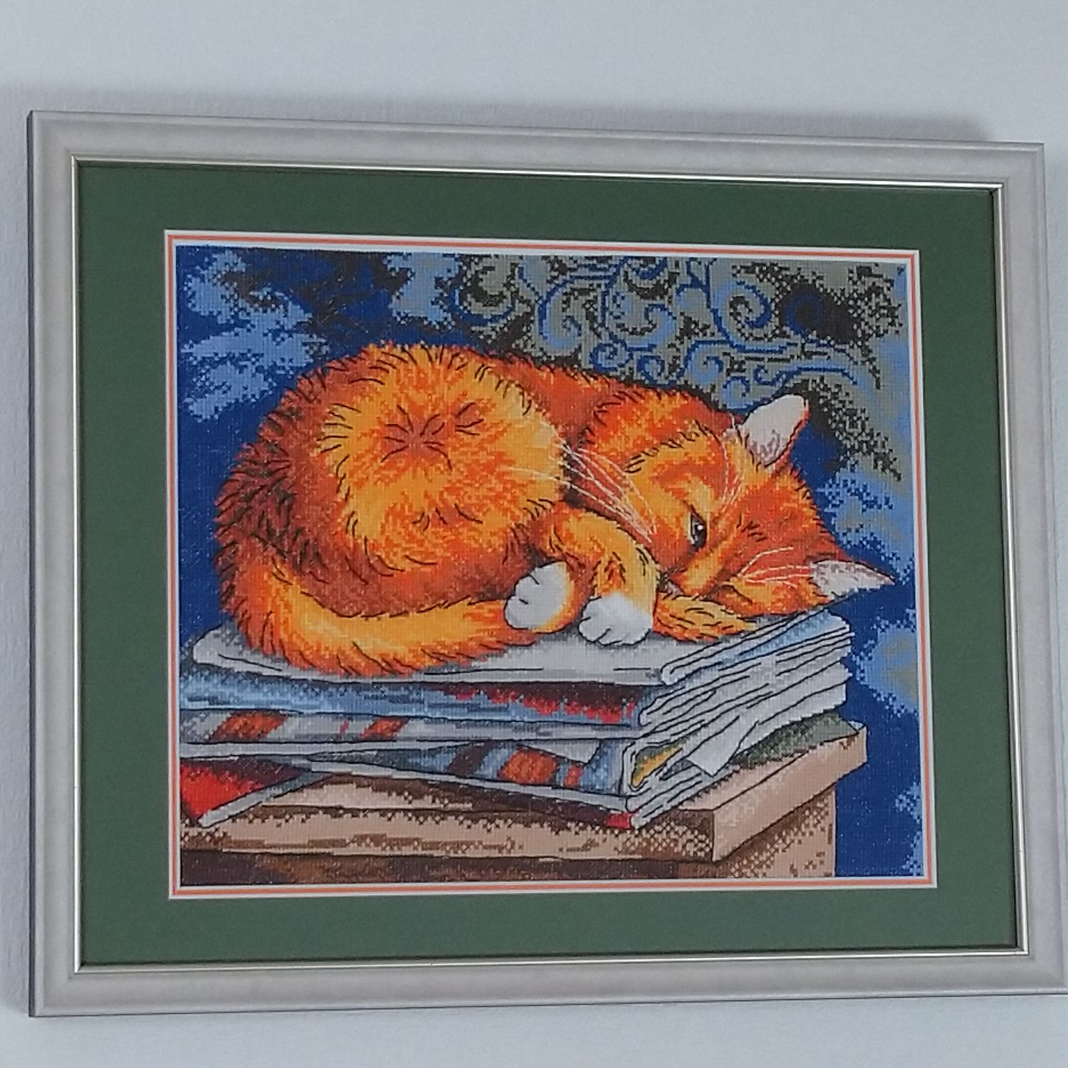 クロスステッチ『待っている猫』 全面刺しに初挑戦。拙い作品ですが、素敵な額装のおかげで一人前の作品になりました。