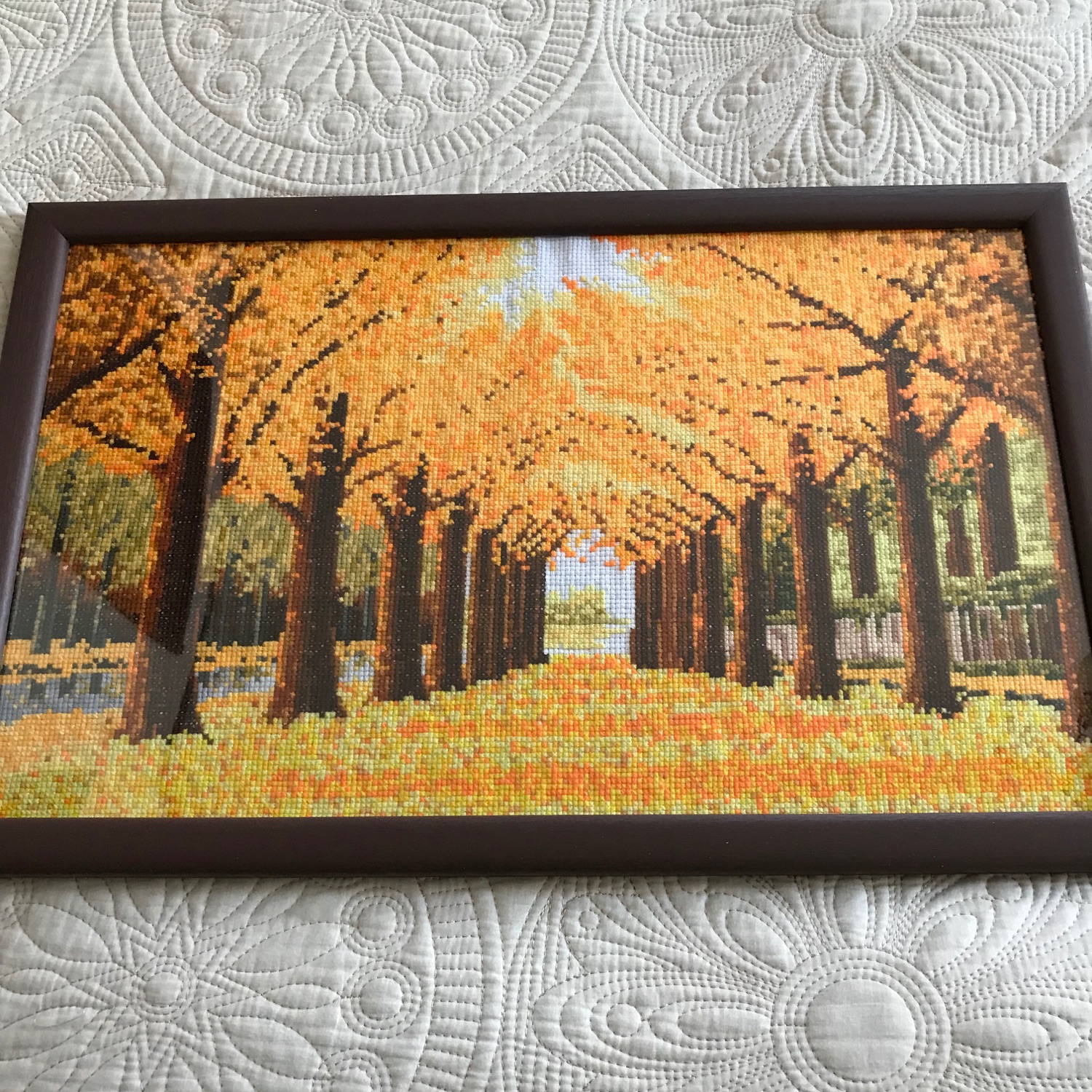 わぁ😲💕とても美しくて綺麗な林道をクロスステッチで再現なされたのですね!完成までとても時間がかかったのではないでしょうか。ブラウンのフレーム色も作品とあっていて統一感があり、個人的に好きな雰囲気です🌼