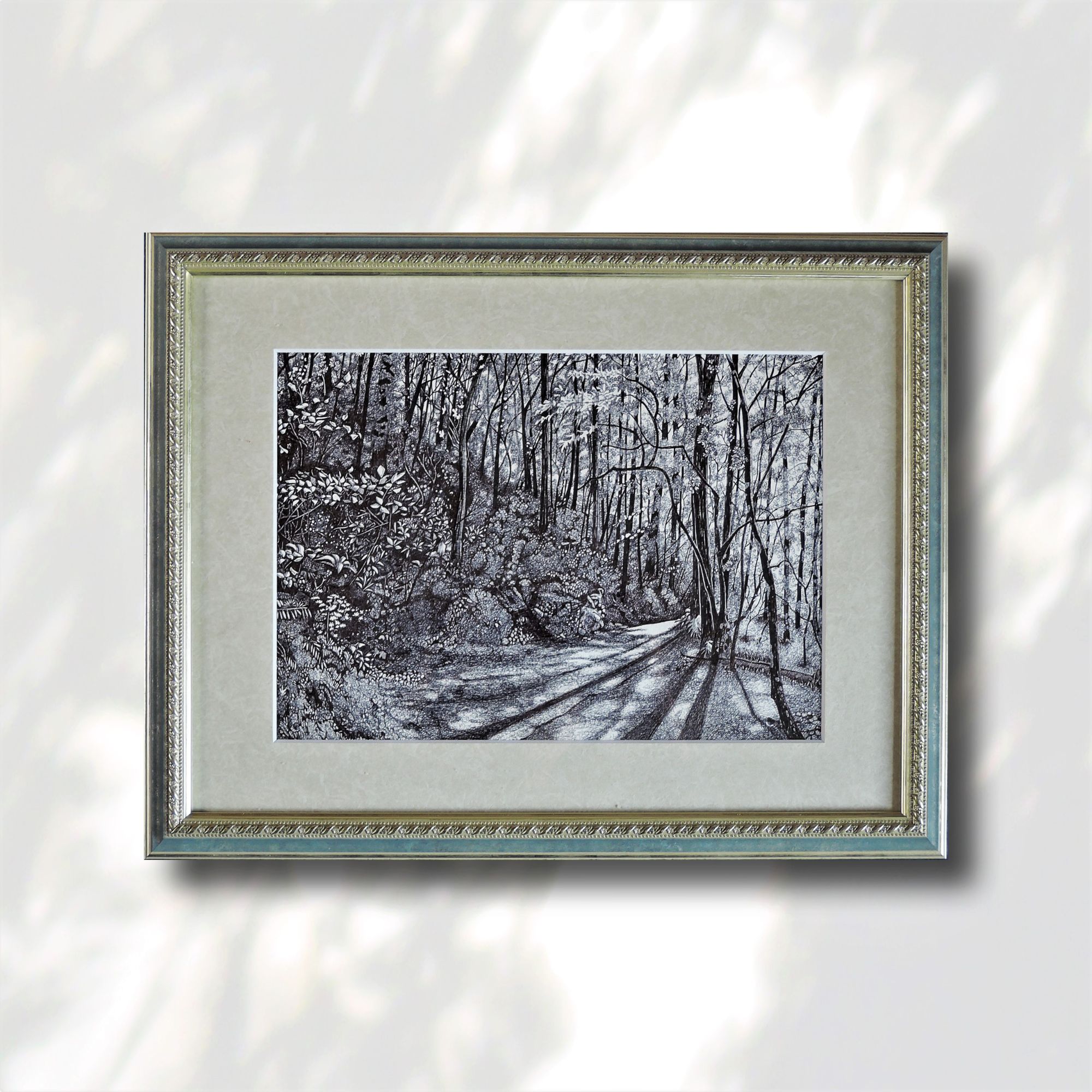 一般額8233ブルーにもみ紙灰の組み合わせで、ボールペン画を額装しました。 額装にあたり、モノクロ写真の額装を数多く調べたところ、黒いフレームに白いマットが定番のようでした。 定番通りではつまらないため、タカハシ様のウェブ上のシミュレーションを駆使して様々な額+マットの組み合わせを試してみました。 結果、淡い緑~ブルー系に、ベージュ系でテクスチャのあるマットの組み合わせだと、解放感と優しさが感じられる雰囲気になることが分かり、この組み合わせにしました。 デザインからは重い額を想像しますが、非常に軽く扱いやすい額です。展示会場への運搬の際に助かります。 ありがとうございました。