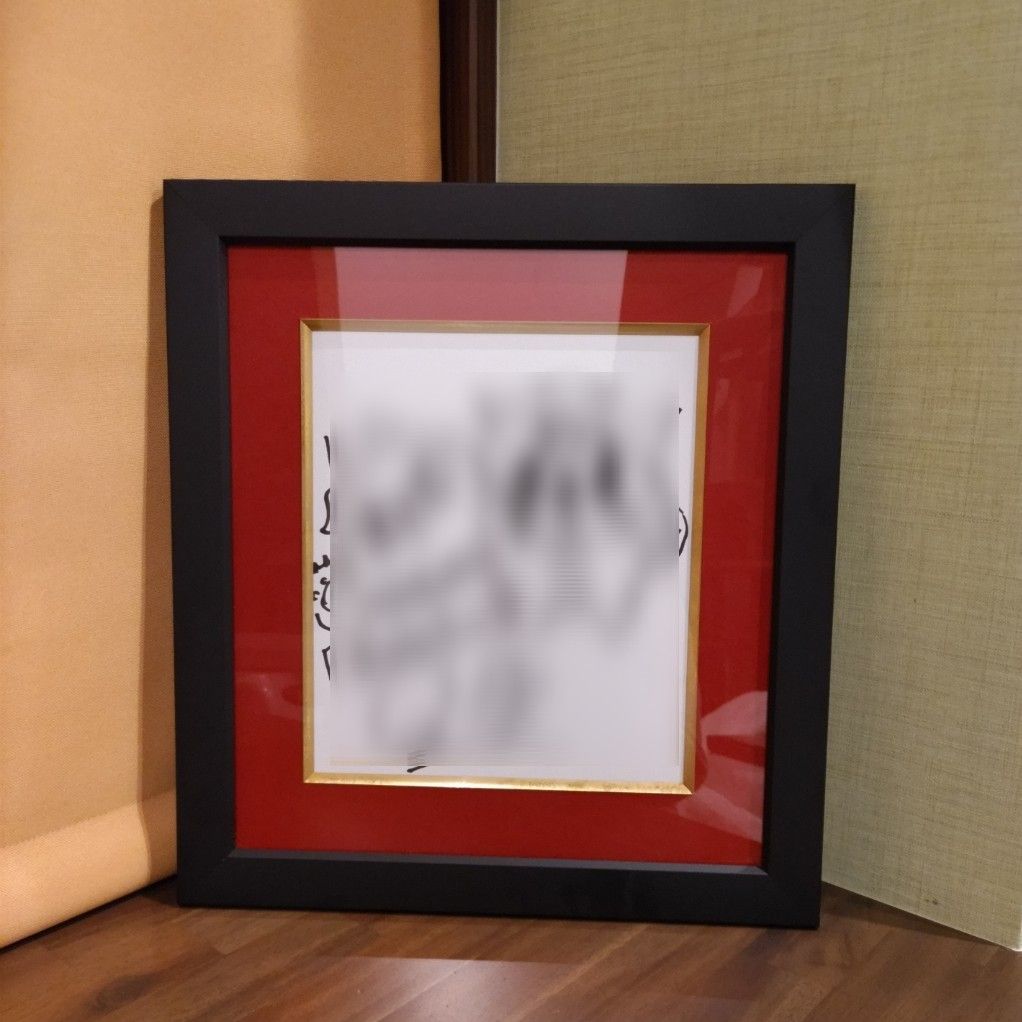 人生で初当選したサイン色紙を大切に保管したくてオーダーフレームを作成していただきました。 テーマカラーは、赤と黒 マットな質感の黒アルミフレームと深みのある赤色、太めの面金加工で重厚な仕上がりに大満足です!!!! 作成ありがとうございました。