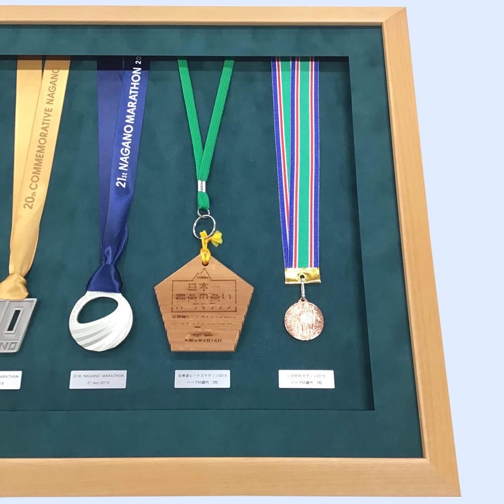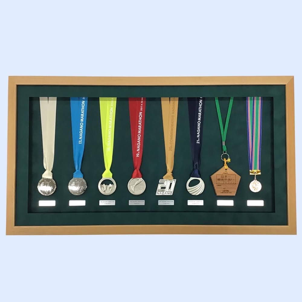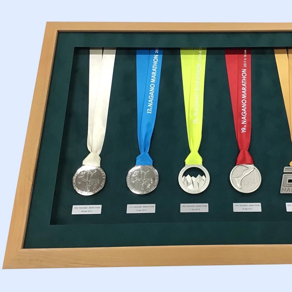 マラソンのメダルを額装しました。長野マラソン、女神湖ビーナスマラソン、いびがわマラソン...お客様の努力の結晶がまとめて見ることができます。 メダルは通常埋め込んで額装しますが今回は埋め込みせず仕上げてみました。 メダルの下のプレートも自社工房にて作成したものです。 使用したフレームは「06-D777WD」、背景等に使用したマットはスエードグリーン(24609)です。