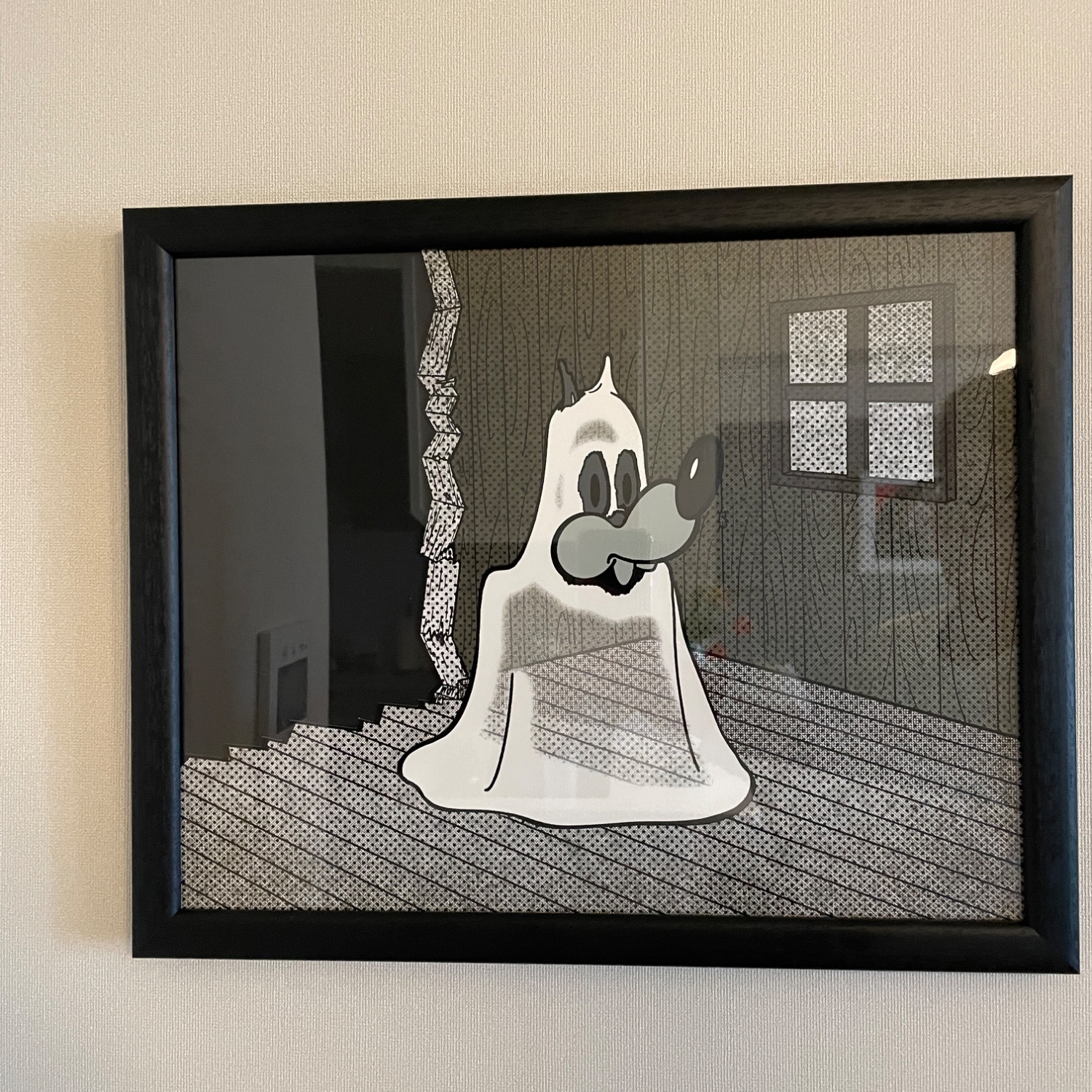 矢入幸一先生のモノトーンをベースに描かているキャラクターの豊かな表情を、さらに引き出してくれるような素敵な額装で、お客様のセンスの良さを感じます。額に入れて飾ることで、より一層「ゴースト」に愛着が湧いてきますね✨