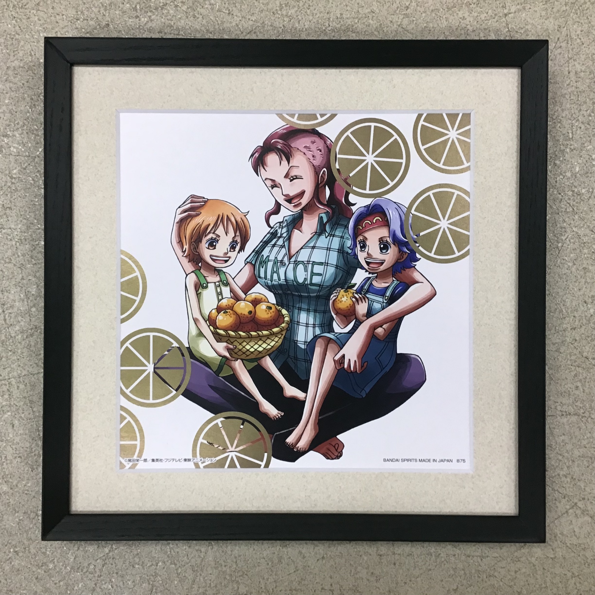 ワンピース一番くじの色紙を額装しました! 人気漫画「ONE PIECE」の登場人物ナミさんの幼少期のイラスト...姉のノジコさん、そして親のベルメールさんと一緒に仲良く笑っています。 色紙と言っても、通常の色紙サイズ(242×273mm)でも1/4色紙サイズ(121×136mm)でもなく、200×200mmの正方形です。 ぴったり寸法の額に入れてもいいですが、今回はひと回り大きい額の250×250mmの濃い緑色のフレームに、コルクのようなベージュ色マット(19002)で額装しました。