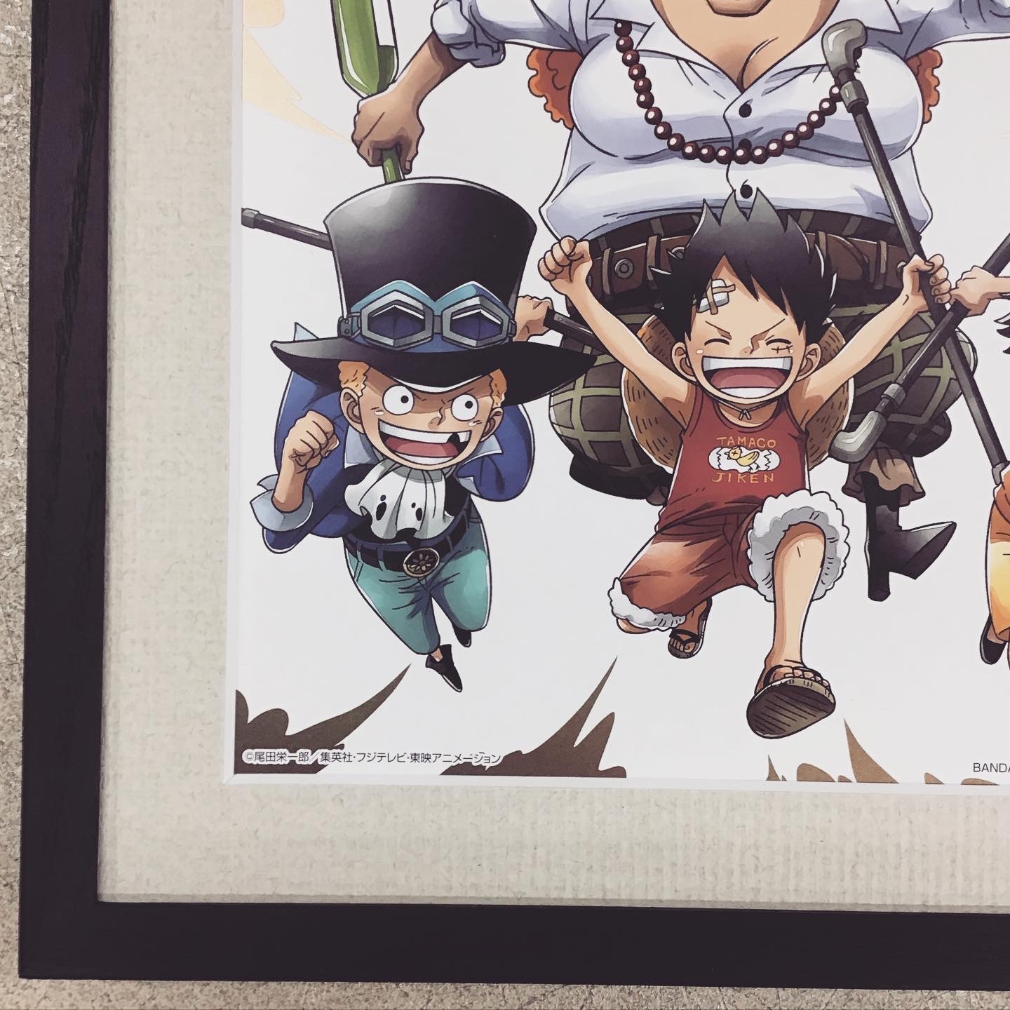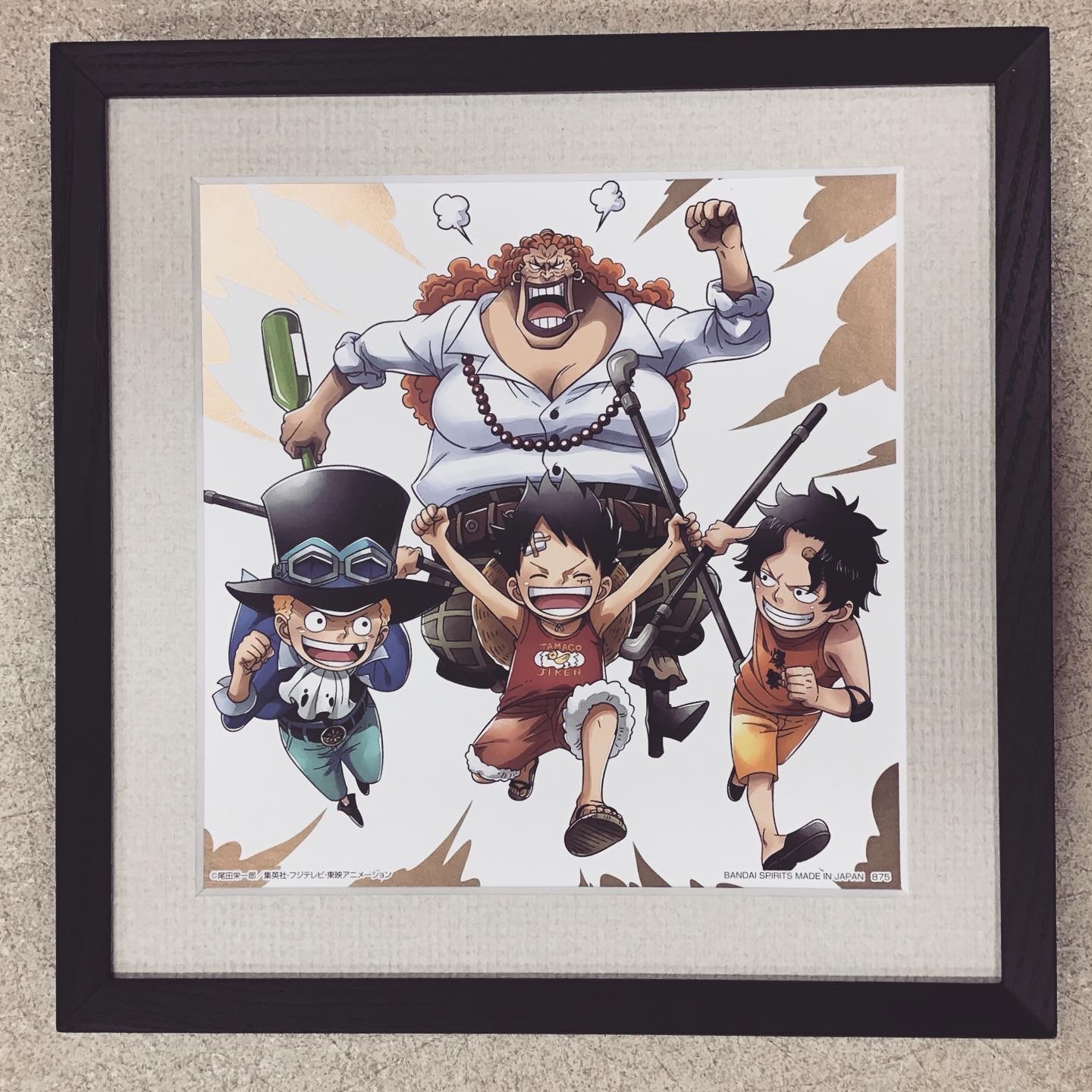 ワンピース一番くじの色紙を額装しました! 人気漫画「ONE PIECE」の主人公ルフィの幼少期のイラスト...エースとサボと一緒に、ダダンから逃げている場面です。 先日投稿したナミさんの色紙と同様で200×200mmの正方形寸法です。 250×250mmの濃い緑色のフレームに、凸凹とした質感のグレー色マット(19006)で額装しました。