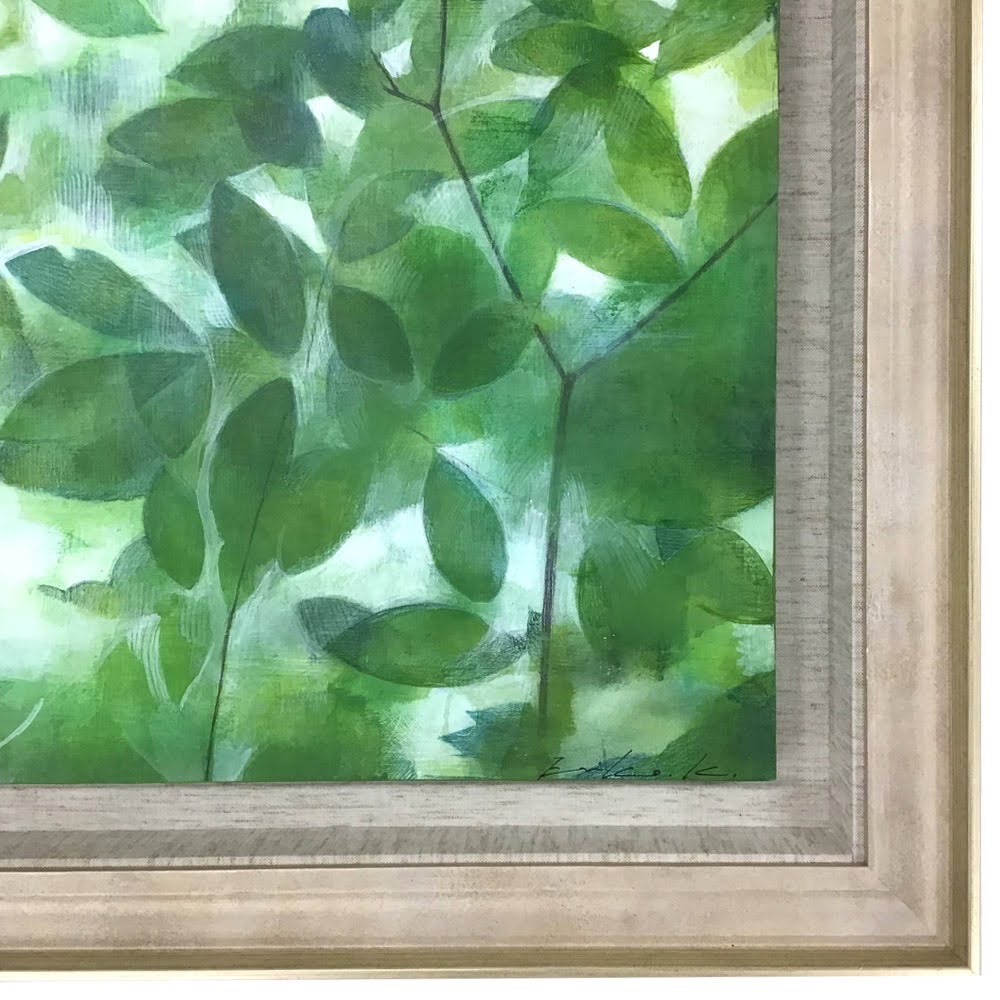 粉川江里子「夢景 緑2」を額装しました! 青々とした葉っぱがとても爽やかな雰囲気を醸し出しています。 粉川江里子様という視覚に障害を抱えながら画家として活動している方の作品です。 S6サイズ(409×409mm)という既製寸法のパネルではありますが、メーカーでは額の種類が少ない寸法です。またピッタリなサイズで額装してしまうと右下のサインが隠れてしまいます。 その場合は、オーダー制作でBOX額装がおススメです! 今回使用したフレームは「D-49324」でBOX内寸は450×450mm、背景と側面には白麻の布(45-103)を使用しています。作品は裏側からネジ留めで固定しました。