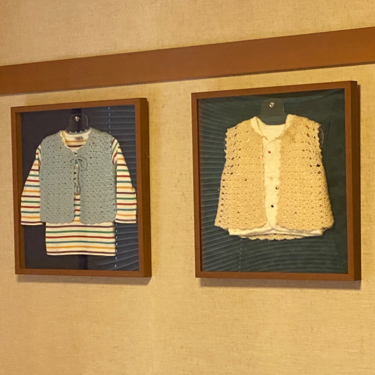 お部屋の雰囲気、壁の色、スエード調の背景色とどれをとってもセンスを感じます。お洋服の額装はバランスが難しいことも多いですが、フレームの色なども違和感なく、額縁屋としてはこう飾ってほしいの理想形です!