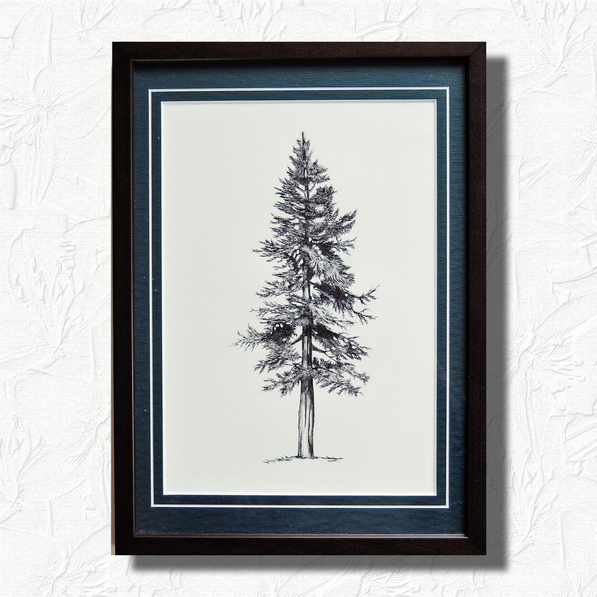 モミの木ボールペン画の額装です。フレーム5767黒のA4サイズに濃紺枠線入りのマットを合わせました。