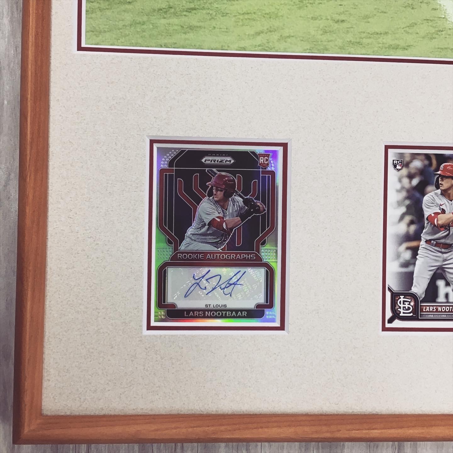 ヌートバー選手のスライディングキャッチの躍動感が素晴らしい写真ですね!ベースボールカードにサイン、一生ものの一品ですね!写真とカードが引き立つ赤色のマットがとてもマッチしています。この度はありがとうございました!